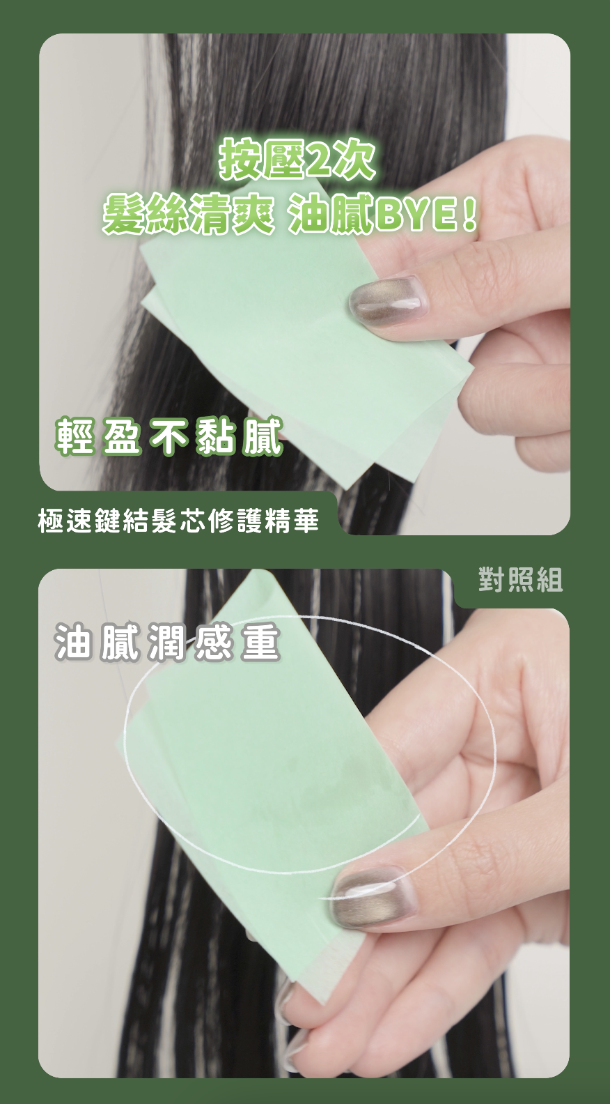 「極速鍵結髮芯修護精華」一抹就吸收看吸油面紙就知道,手上也不會有多餘的潤滑油膩感,對照組一樣是抹上髮乳型商品,髮絲看起來雖然潤澤但表面還是有些油膩感,手上的油膩度也是需要沖洗一下才會掉~這次實測結果「極速鍵結髮芯修護精華」表現真的優秀到不行!
