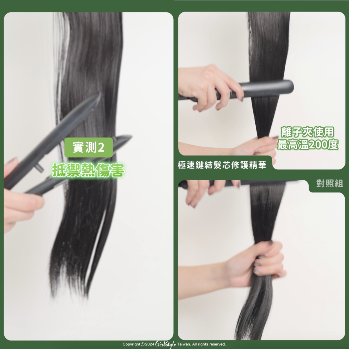 出門前經常都會需要吹整或是用離子夾、電棒捲來維持造型,尤其女孩們應該都懂~但其實經常使用造型工具也都會讓造成頭髮受損,小編特地模擬平時使用離子夾整理的情形,將兩組髮束同時使用預熱後200度的離子夾,連續使用20次