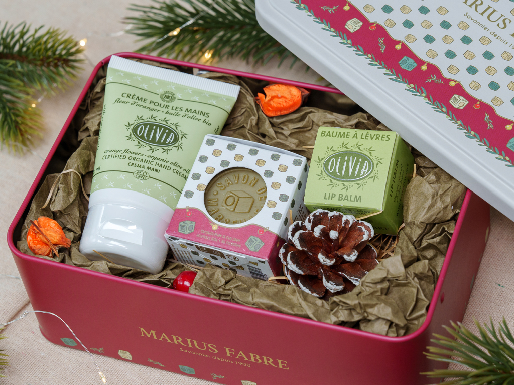 - 經典橄欖油馬賽皂、聖誕限量版100g*1、橄欖油禮讚橙花護手霜50ml*1、橄欖油禮讚護唇膏7ml*1