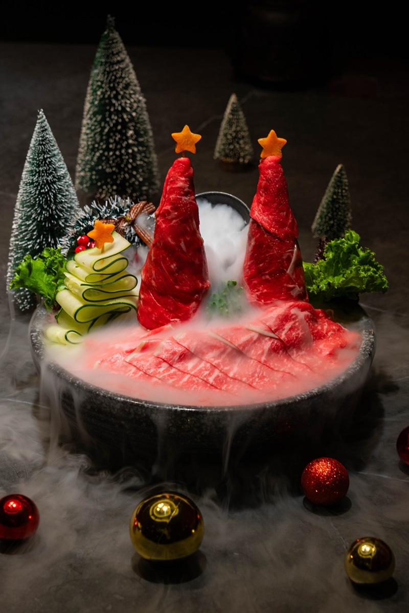 此次推出的聖誕限定套餐,從2人到10人靈活選擇,每款均設計精緻且誠意滿滿,雙人套餐優惠價僅需2,459元起,並享加購指定啤酒享買一送一,讓每一位賓客都能享受到溫暖、熱鬧的節慶氛圍。套餐中的招牌亮點非「肉肉聖誕樹」莫屬,以「極上澳洲和牛元寶肉M4」與「極上澳洲和牛眼肉M7」二種部位的頂級澳洲和牛精心堆疊組成雙樹造型,並點綴可愛紅蘿蔔星星,一上桌便吸引全場目光,屬於絕對不能錯過的季節限定菜品!