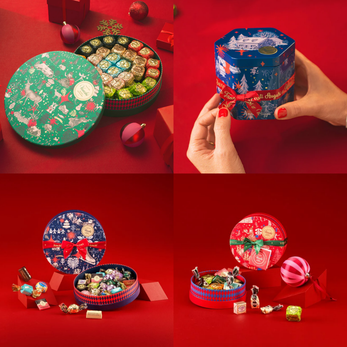 各款禮盒搭配不同系列Venchi巧克力,可以依據口味喜好挑選,而綜合巧克力金屬長方禮盒(36入) 、P&M巧克力綜合包(19入)、綜合巧克力金屬六角禮盒 (12入)、金屬迷你書禮盒 (18入)和綜合巧克力金屬聖誕樹禮盒 (9入),會有包含聖誕節限定的金色彗星牛奶巧克力球、綠色彗星黑巧克力球、紅色彗星牛奶慕斯巧克力球與聖誕薄片巧克力。