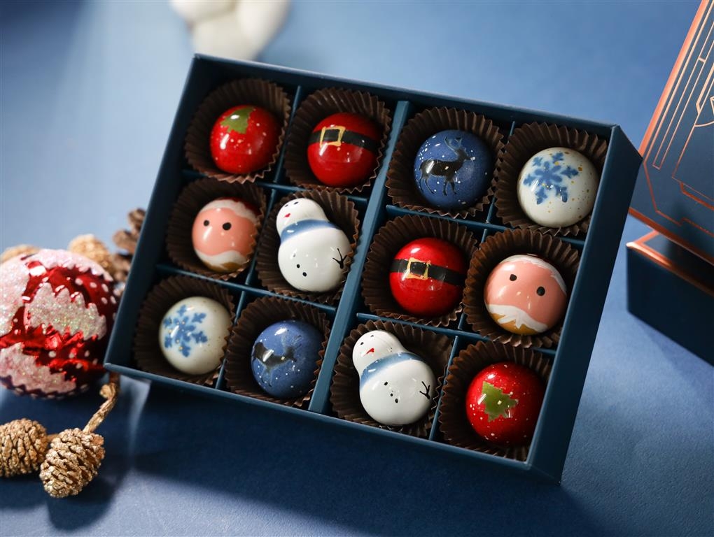 台中長榮桂冠酒店推出超可愛的聖誕巧克力!6種聖誕造型口味包含用鳳梨、椰漿與白巧克力調製成內餡,加入藍色柑香酒與蘭姆酒調味的「藍色夏威夷小雪人巧克力」、新鮮草莓果泥融合72%全果巧克力製成的內餡,結合紅酒醋製成果餡的「酒醋草莓聖誕樹巧克力」、草莓醬汁與法國法芙娜白巧克力作為基底,加入凍乾的大湖草莓碎粒的「草莓香頌聖誕老人腰帶巧克力」、法國薰衣草花瓣與法國奶油調製而成「薰衣草白雪花巧克力」、新鮮檸檬汁熬製而成果醬,搭配72%全果巧克力與法國橘皮丁做成內餡的「柑橘檸檬聖誕老人巧克力」、法國紅酒搭配薑汁熬煮而成的醬汁,融入瑞士巧克力的「薑汁紅酒糜鹿巧克力」。