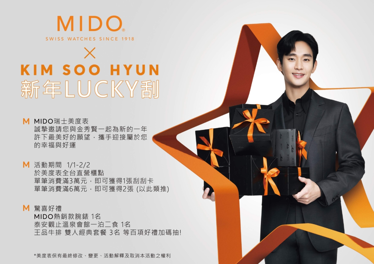 此外,MIDO美度表與亞洲品牌大使-金秀賢一起為新的一年許下最美好的願望,攜手送上屬於每一位的幸福與好運,特別推出「MIDO新年LUCKY刮」新春刮刮樂活動。自1月1日至2月2日,於美度表全台直營櫃點,凡單筆消費滿3萬元,即可獲得刮刮卡,單筆消費滿6萬元,則可獲得更多刮刮卡,依此類推。每一幅刮刮卡都是對新年的期待,為年度添上樂趣與小驚喜。包含MIDO熱銷款腕錶、泰安觀止溫泉會館雙人房一泊二食、王品牛排雙人經典套餐等百項好禮,還有更多加碼抽獎。金秀賢與MIDO一同祝福大家在新的一年裡,事事如意,財運亨通,與摯愛共度每一個珍貴的時刻!
