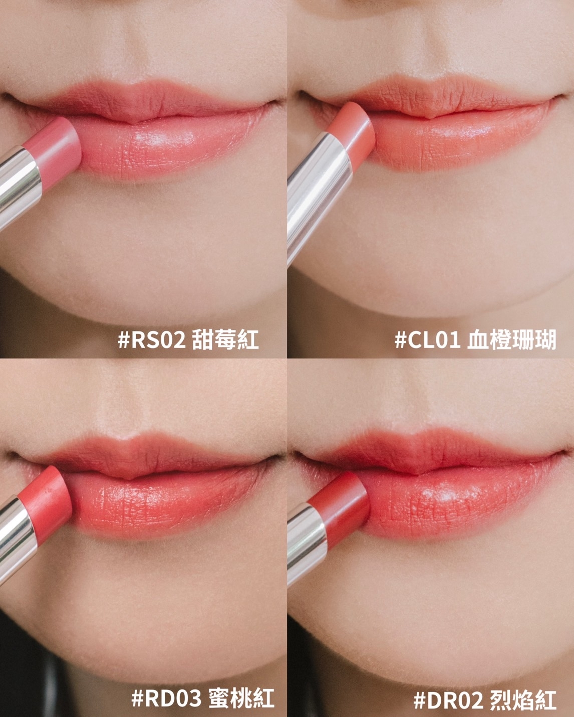 #RS02 甜莓紅透著一股俏皮的甜美感,#CL01 血橙珊瑚則散發出暖洋洋的活力氣息~喜歡柔嫩氛圍的女孩一定會愛上#RD03 蜜桃紅,那種戀愛般的甜蜜感讓人無法抗拒,而#DR02 烈焰紅則絕對是霸氣女王的最佳選擇,每一抹都讓人移不開目光!