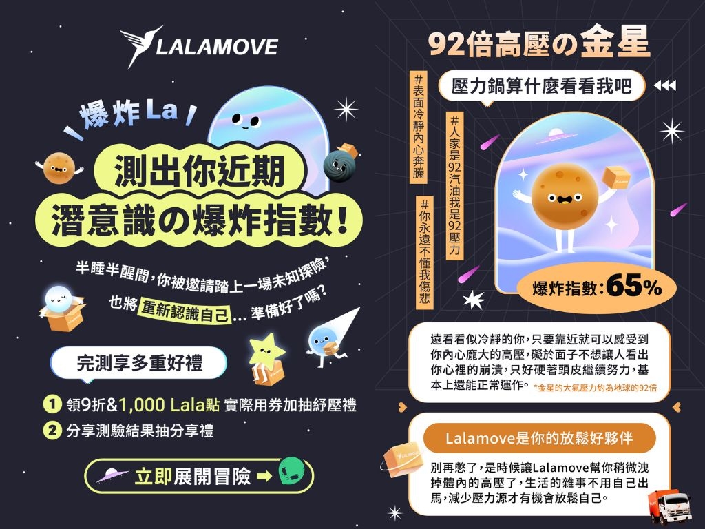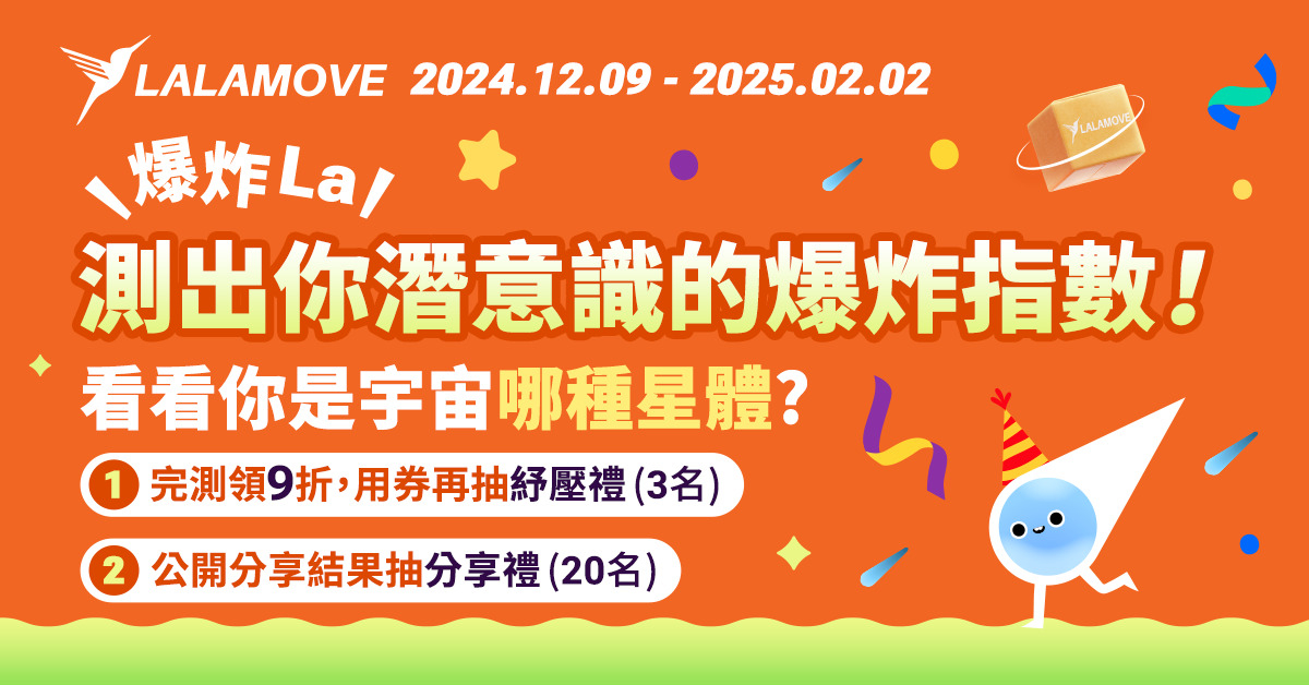 2025年才剛剛展開,但工作壓力就已經大到快要喘不過氣了嗎?一起來玩 Lalamove 全新推出的心理測驗,只要3分鐘就能分析出你近期潛意識中的「爆炸指數」!參與心理測驗就能領取Lalamove即時貨運9折優惠券,著急送件、懶得出門都能叫Lalamove 幫你送,降低你的生活爆炸指數!完成指定任務還可再抽好禮,多樣好禮等你帶回家!