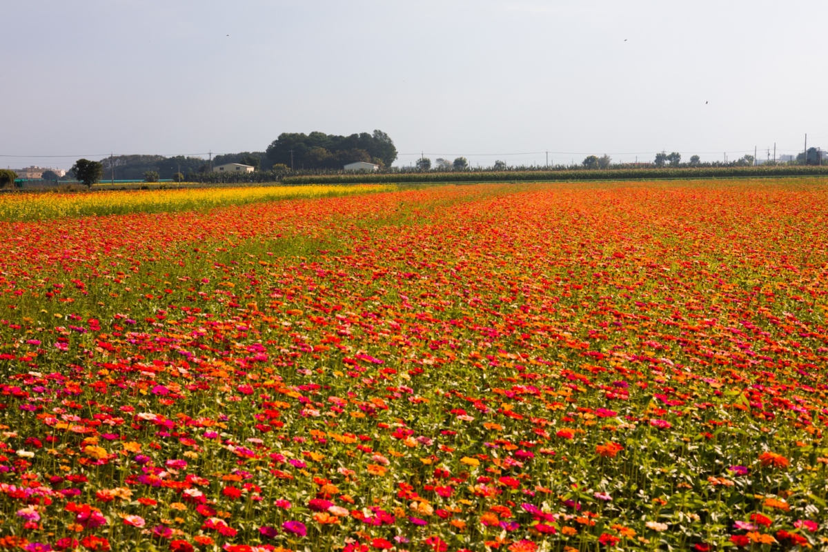 雲林莿桐擁有23公頃超大的花海!!從縣道156線孩沙里福天宮牌樓到樹仔腳堤防公園全部都屬於花海大道,沿路都可欣賞花海美景與享受花香。滿滿紫紅、橘黃及混合色的百日草、金黃色向日葵與波斯菊,完全就像一整塊彩色大畫布。