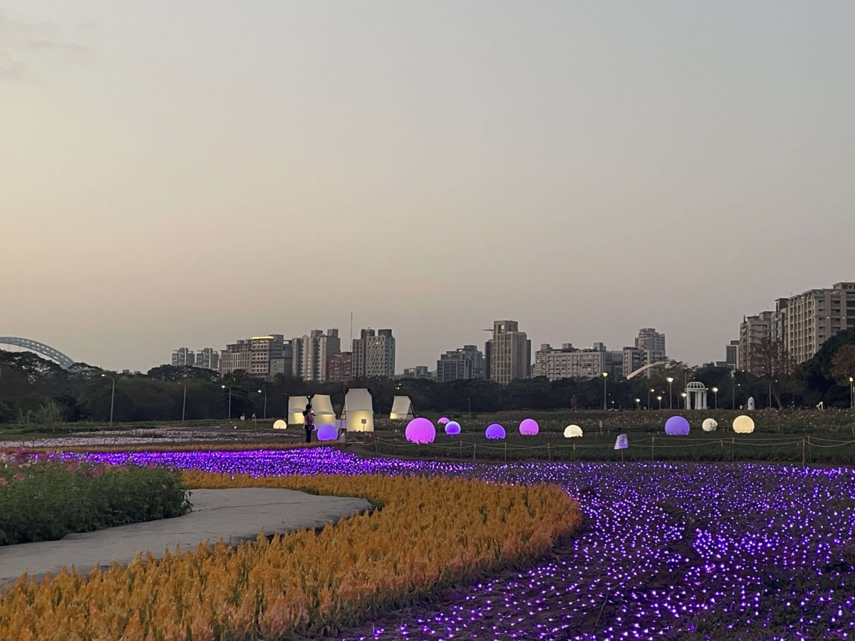 現場還有還藏有許多大型球與燈飾,夜晚天黑時,古亭河濱公園就會瞬間變成閃亮的花海!欣賞的感覺截然不同喔~
