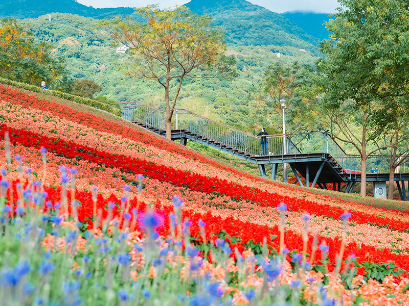 坐落在大屯山下的北投三層崎公園,獨特的斜坡地形打造五顏六色繽紛的「彩色浪花海」1月17日正式開幕!由薰衣草、四季秋海棠、銀葉菊、孔雀草、大理花、五彩石竹6種花充滿在三層崎公園中,一整片超壯觀的花海美不勝收~