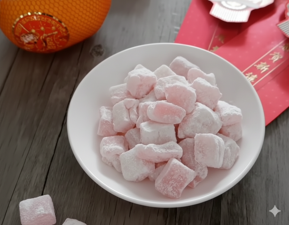 吉紅糕是閩南、台灣傳統糕點,又稱「桔紅糕」,吃起來口感軟糯Q彈。它以糯米粉為主要原料,加入糖、水等製成,有時也會加入金桔或水果香料增加風味。「吉紅」兩個字本身就帶有吉祥喜慶的寓意,紅色在中華文化中更有代表喜氣、熱鬧的顏色,因此新年吃吉紅糕,象徵著在新的一年能夠萬事如意、喜氣洋洋;有人認為吉紅糕的外形類似古代的碎金和碎銀,白色糕體代表金子,紅色點綴代表銀子,因此吃吉紅糕也有著步步高升、財源廣進的象徵,期盼新的一年事業順利、財運亨通。 在台灣,吉紅糕除了在新年期間食用外,也常在拜天公等祭祀場合出現,表達對神明和祖先的敬意和感謝。