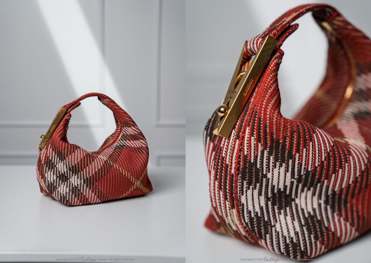 Burberry Peg 鐵鏽色迷你旅行包,採用義大利針織格紋製成,版型柔和又立挺,以新季紅色調巧思演繹,包身色彩豐富又搶眼,內裡則是選擇輕盈的特殊無襯裡設計,以拉鍊開合為主,包身一邊飾有衣夾造型掛扣,上頭淺淺刻上 Burberry 字母品牌徽標,可固定弧形頂部提柄,手提或勾在手腕上都很實用可愛。