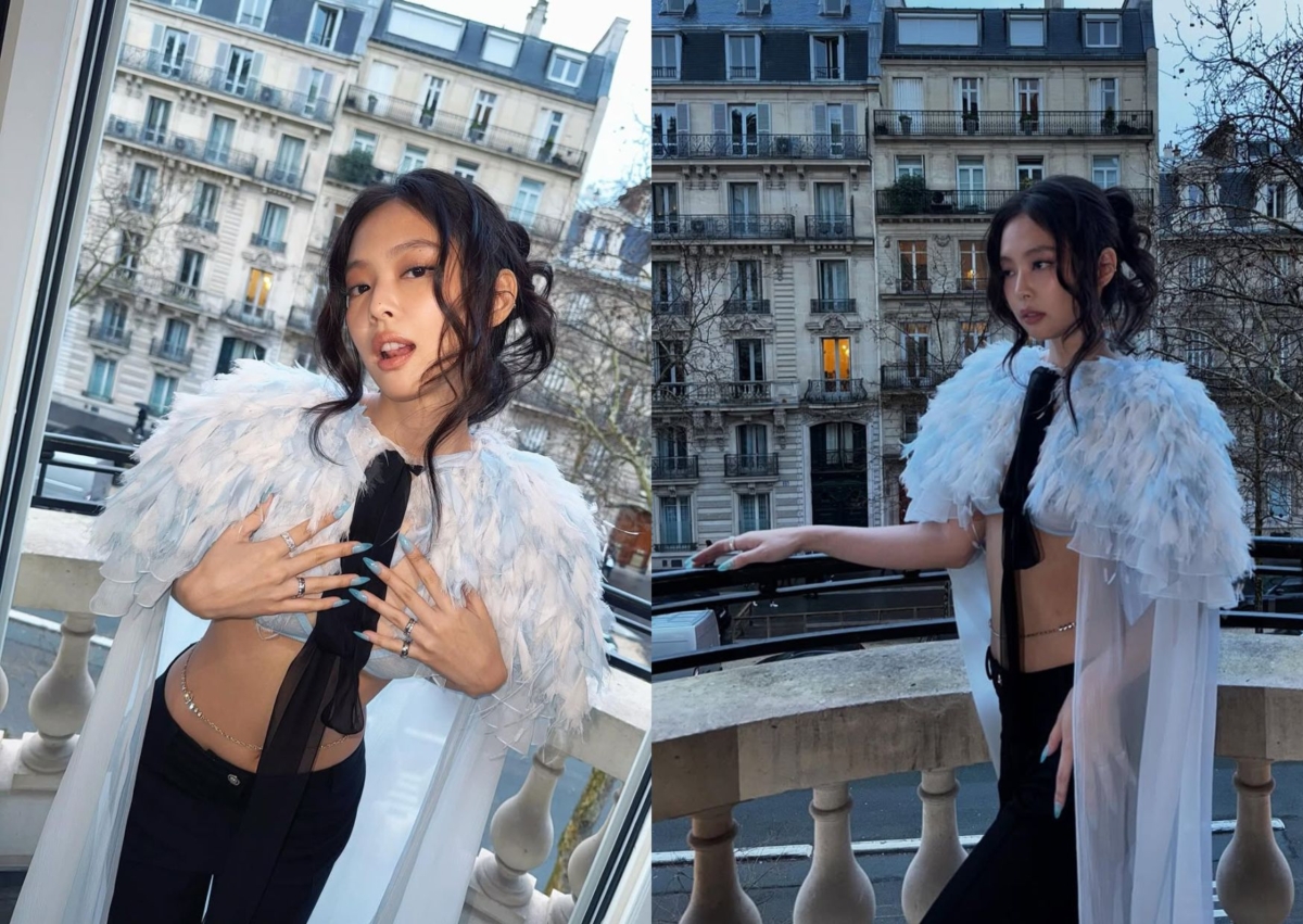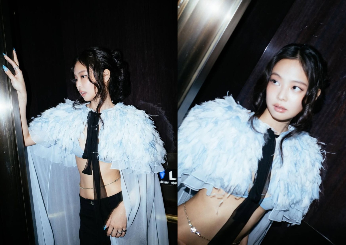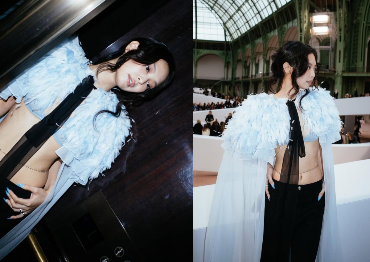 Jennie 兩套時裝周造型盤點:Chanel 藍色羽毛、Jean Paul Gaultier 水鑽透視裝
