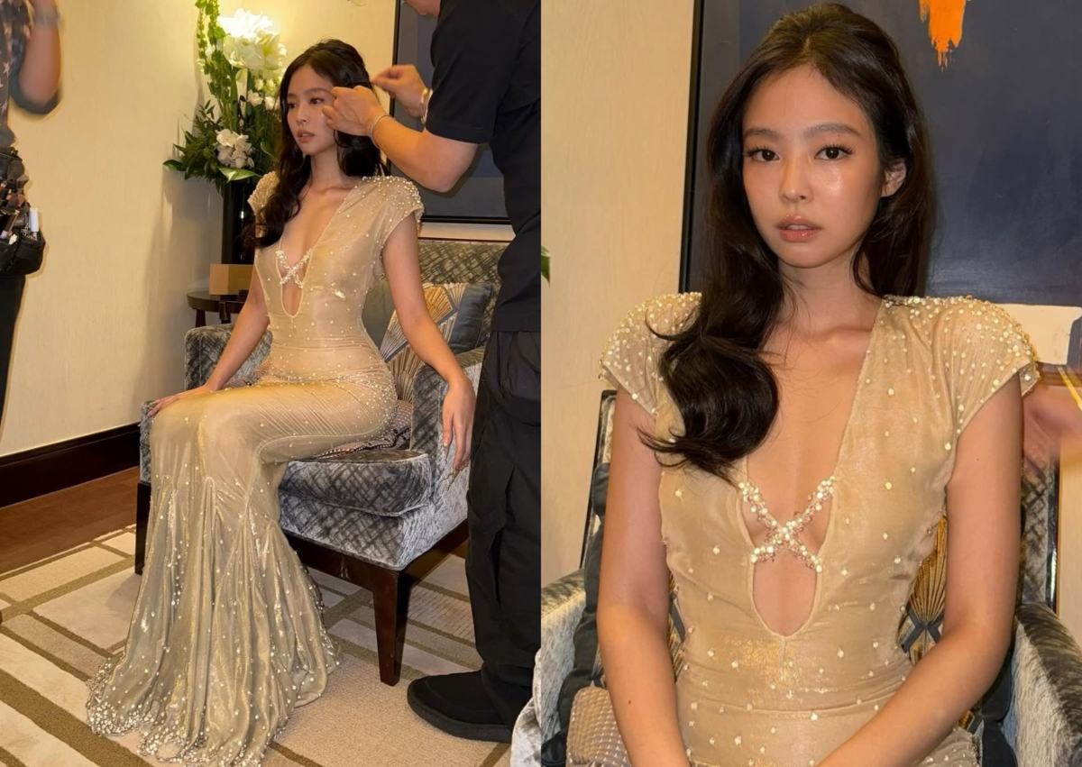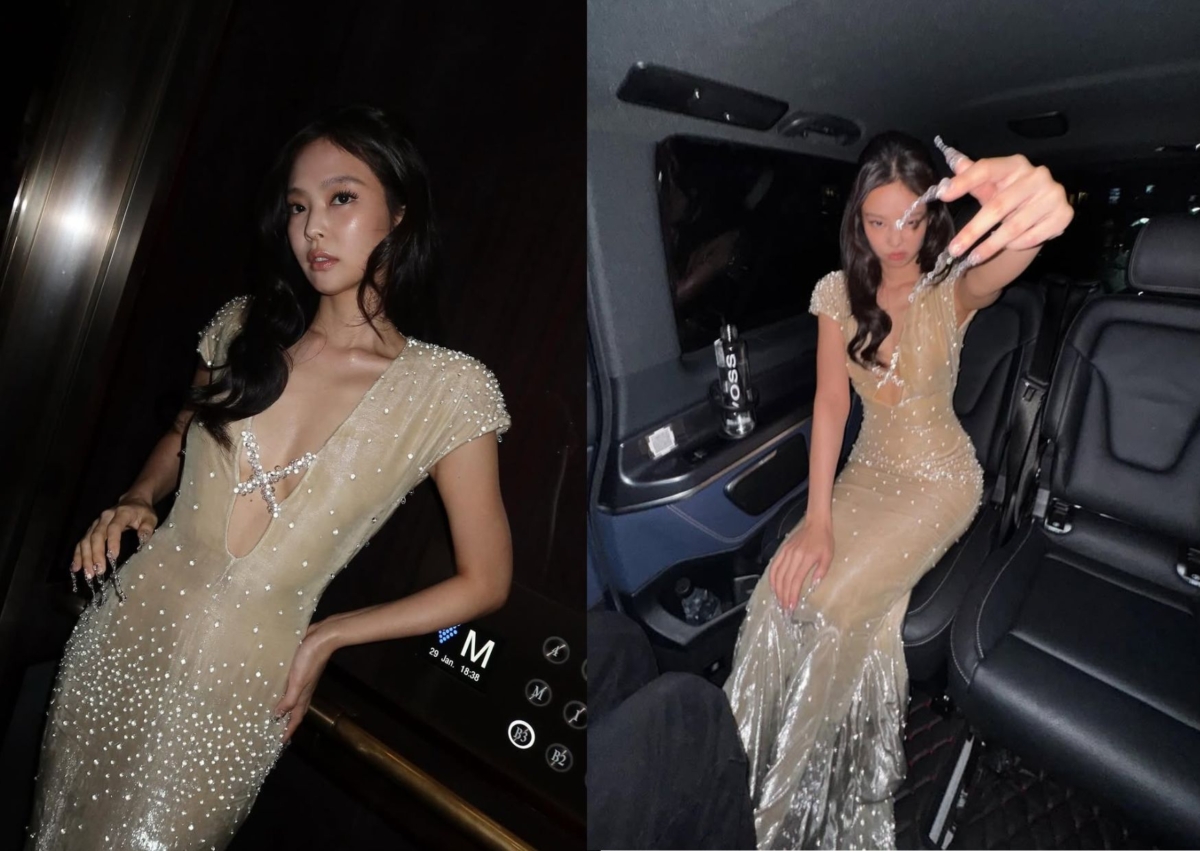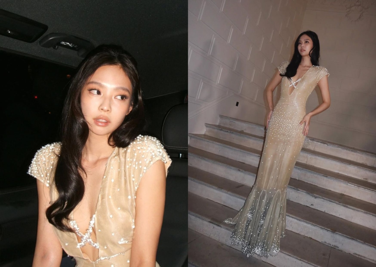 Jennie 驚喜亮相法國高級時裝 Jean Paul Gaultier,穿著品牌 2008 年春夏高級訂製系列的裸色水鑽洋裝,深 U 剪裁一路挖到近腰部,胸前以水鑽交織而成的線條固定,整件洋裝都點綴上水鑽,下擺則以金屬感的魚尾造型為設計,超顯身材線條,視覺效果滿分。