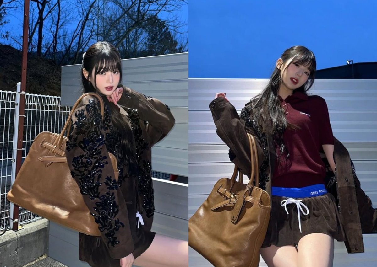同樣身為 Miu Miu 品牌代言人的張員瑛,也身穿整套 Miu Miu 針織 Polo 衫、花苞短裙,外搭一件刺繡亮片寬大外套,全身重點來自肩上那顆大包!來自 Miu Miu Aventure 手袋,袋型復刻品牌經典設計,麻質混紡內層、設有拉鏈袋和貼袋,以更輕盈的結構和休閒態度重新演繹,壓紋字母標誌、金色金屬飾件則注入復古氣息。