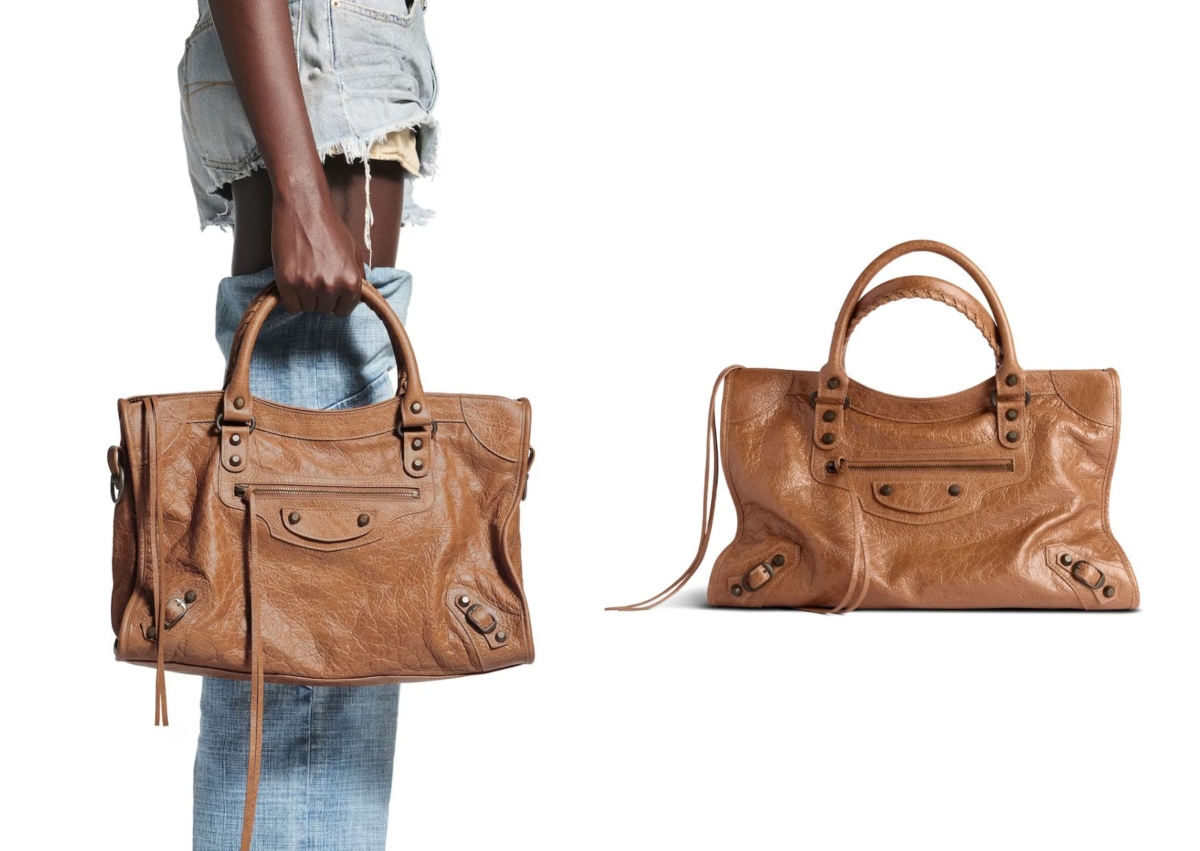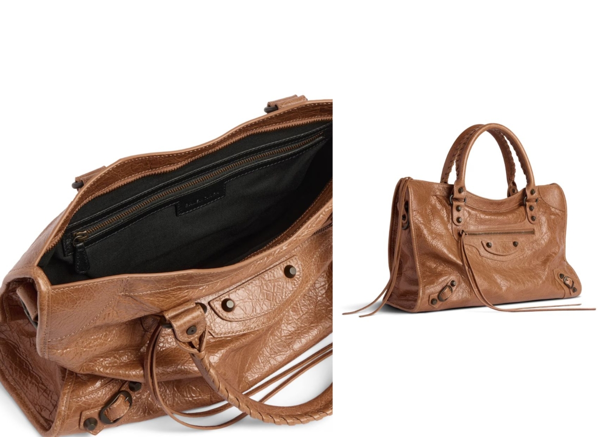 Balenciaga 經典機車包,不論怎麼重新回歸,仍然是時尚迷的心中最愛, 這款 Le City 中號包採用駝色 Arena Storico 小羊皮製成,比起一班的黑色更為溫柔許多,黃銅五金詮釋復古氣息,以皮革手工辮子當作手柄,具有可調節和可拆卸的肩帶,怎麼揹都有種霸氣態度。
