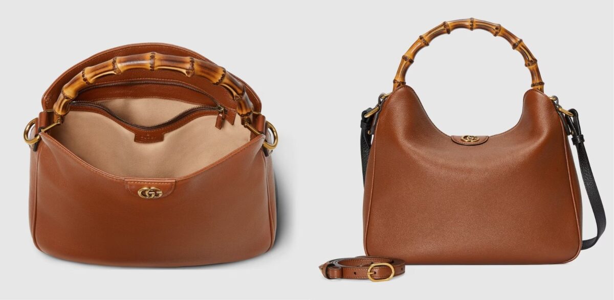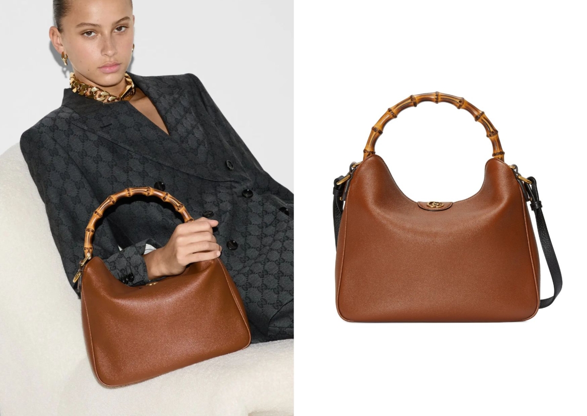Gucci Diana 這款小型肩揹袋結合了品牌各種元素,以竹製手挽及雙 G 配件為設計特色,採用麂皮微纖維內裡、兩個分層袋和磁扣開合,另外附有的長肩帶特地選用對比鮮明的灰色皮革,讓整體呈現撞色感,既不會太過成熟又新穎。