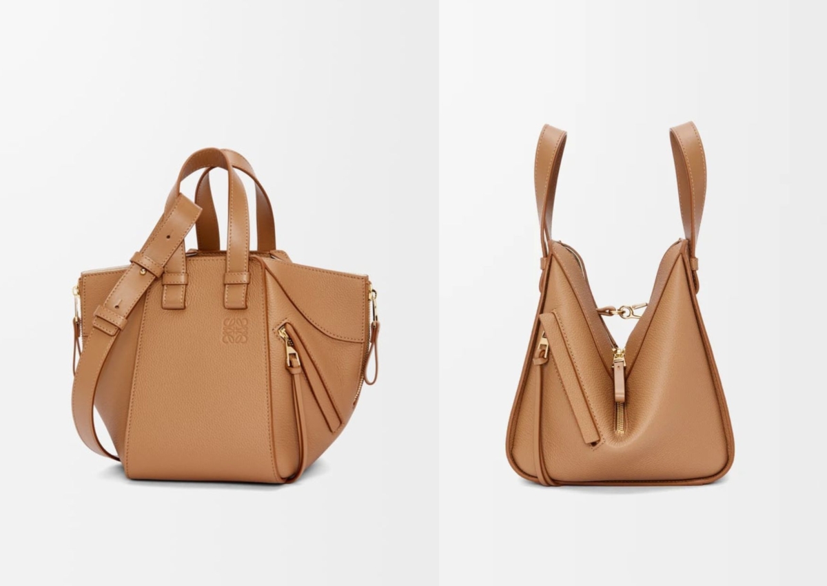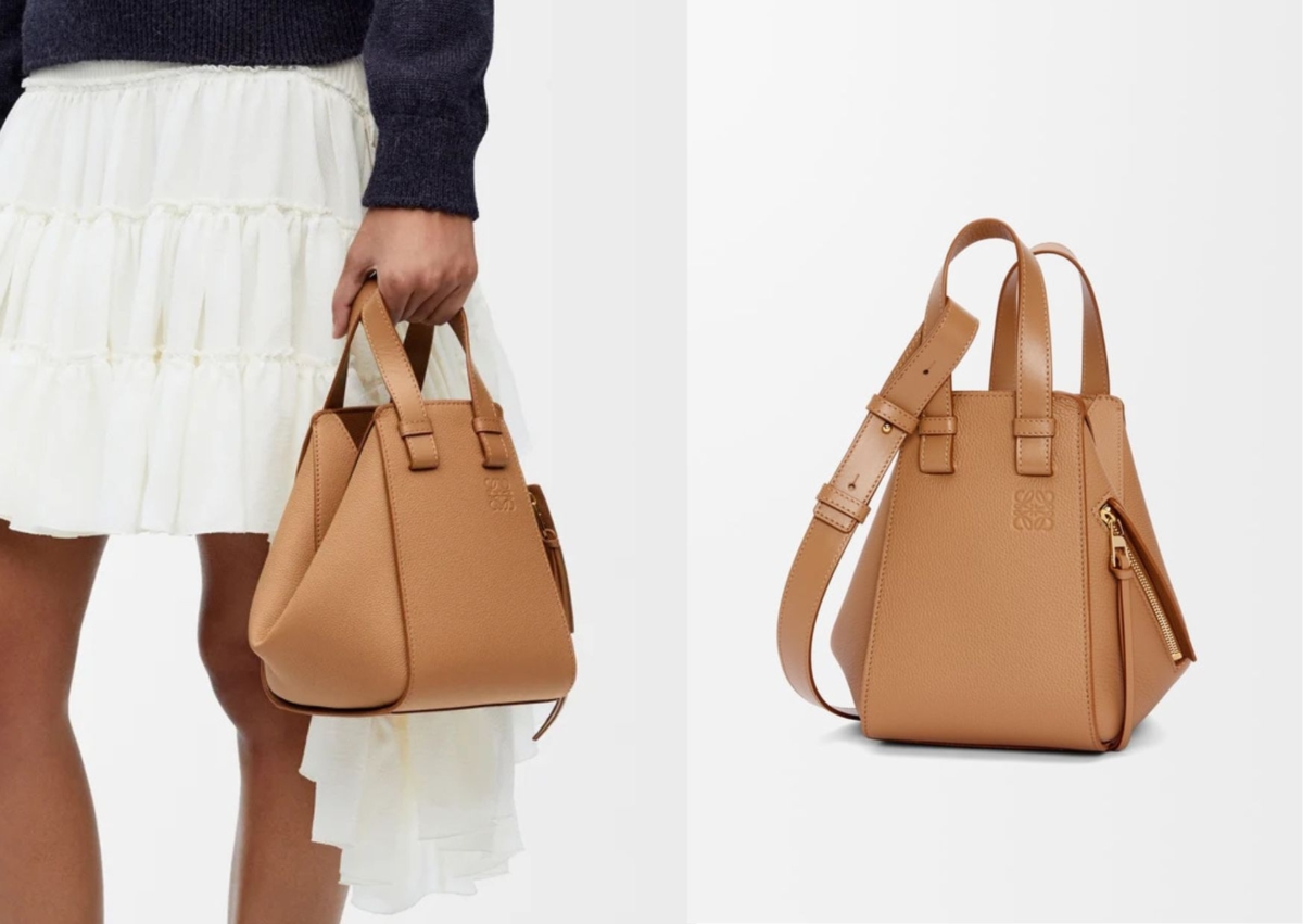 LOEWE 這顆有趣的 Hammock 手袋大家應該不陌生吧?重點特色是具有多功能設計,採用柔軟側面包體,可以隨意改變形狀,包身採用柔軟粒面小牛皮製成,太妃糖色設計看似柔軟又可愛,內部以鉤扣為設計開合,人字形棉質帆布內裡,包身印有低調的 Anagram 壓紋,肩背、斜背或手提都適合。