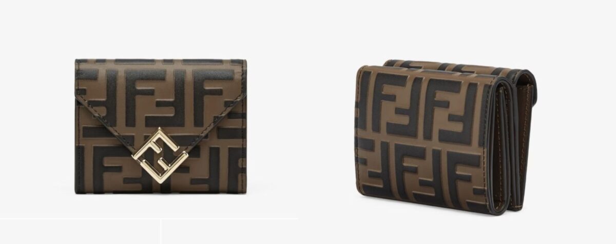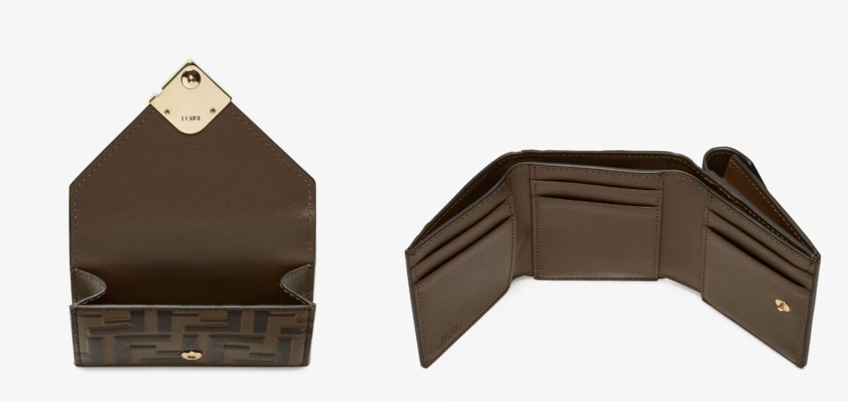 Fendi FF Diamonds 中型款式三摺疊皮夾,採用低調深棕色呈現,帶有一絲奶色調,完美符合摩卡慕斯色,包身區隔成六個卡夾、一個鈔票隔層以及一個按扣設計的零錢袋,包身飾有浮雕黑色 FF 印花,鍍金金屬 Logo 則注入高級氛圍感。