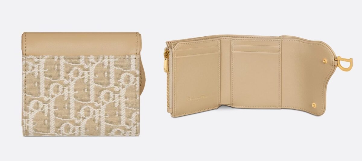 Dior Saddle Lotus 錢包 採用 Dior Oblique 緹花及天然色光滑小牛皮製成,飾有不對稱翻蓋和復古金色飾面金屬 D 字蹬型吊飾,頌揚經典 Saddle 線條的美感,包身以天然色 Dior Oblique 緹花製作,搭配同色系光滑小牛皮細節,設計經典雋永,淺色外觀非常適合春夏使用。