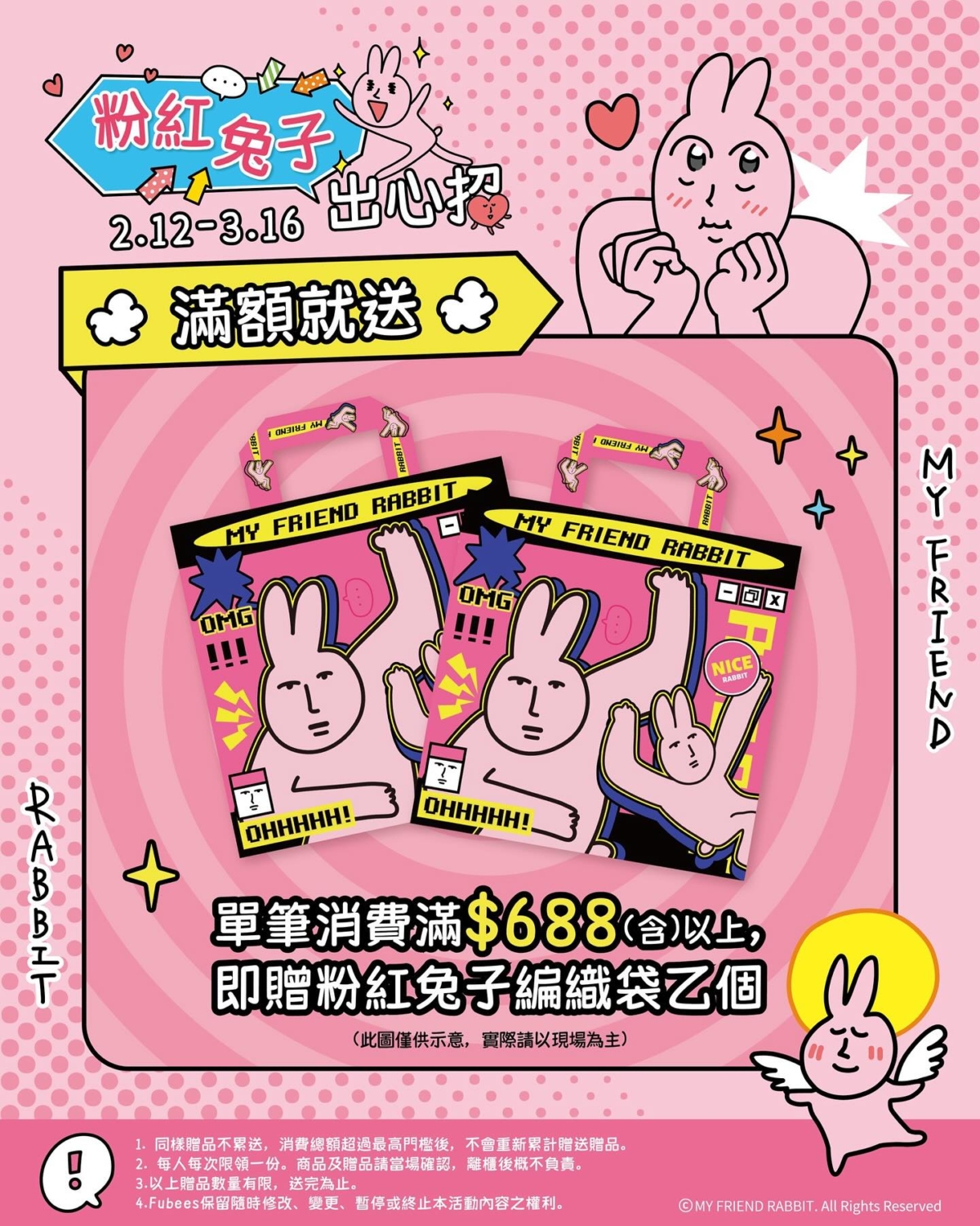 單筆消費滿額688元還會贈送限量「粉紅兔子編織袋」喔!帶著它搖頭晃腦開心逛街♡(贈品運送時間稍有延誤,凡在2/12-2/17消費滿額者,可以在快閃期間憑發票回到門市兌換)