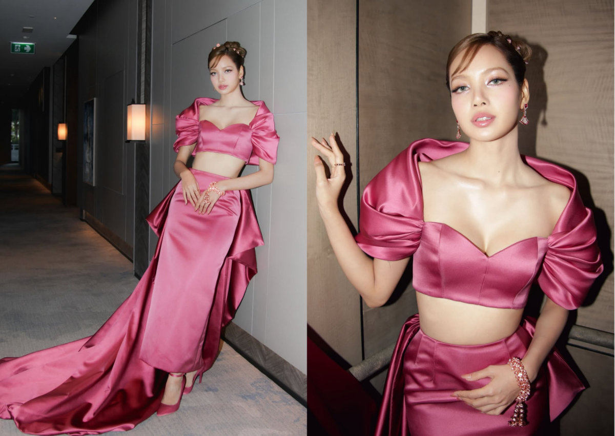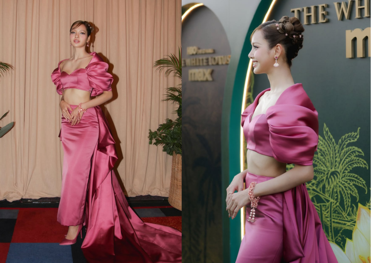 劇集開播後,Lisa 和劇組演員們來到拍攝地曼谷進行壓軸宣傳,Lisa 當天穿著 Louis Vuitton 為她訂製的緞面桃紅禮服,搭配 Bvlgari 高級珠寶,化身為一朵浪漫又有點可愛的桃色玫瑰,袖子設計採用抽皺垂墜感呈現,宛如層層疊起的花瓣,而裙擺的魚尾設計更凸顯氣場,果然是實至名歸的泰國公主,時尚資源值得一探。