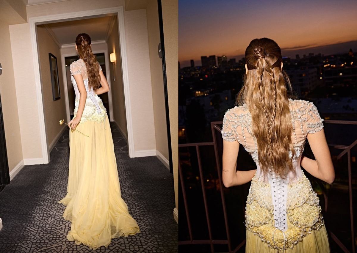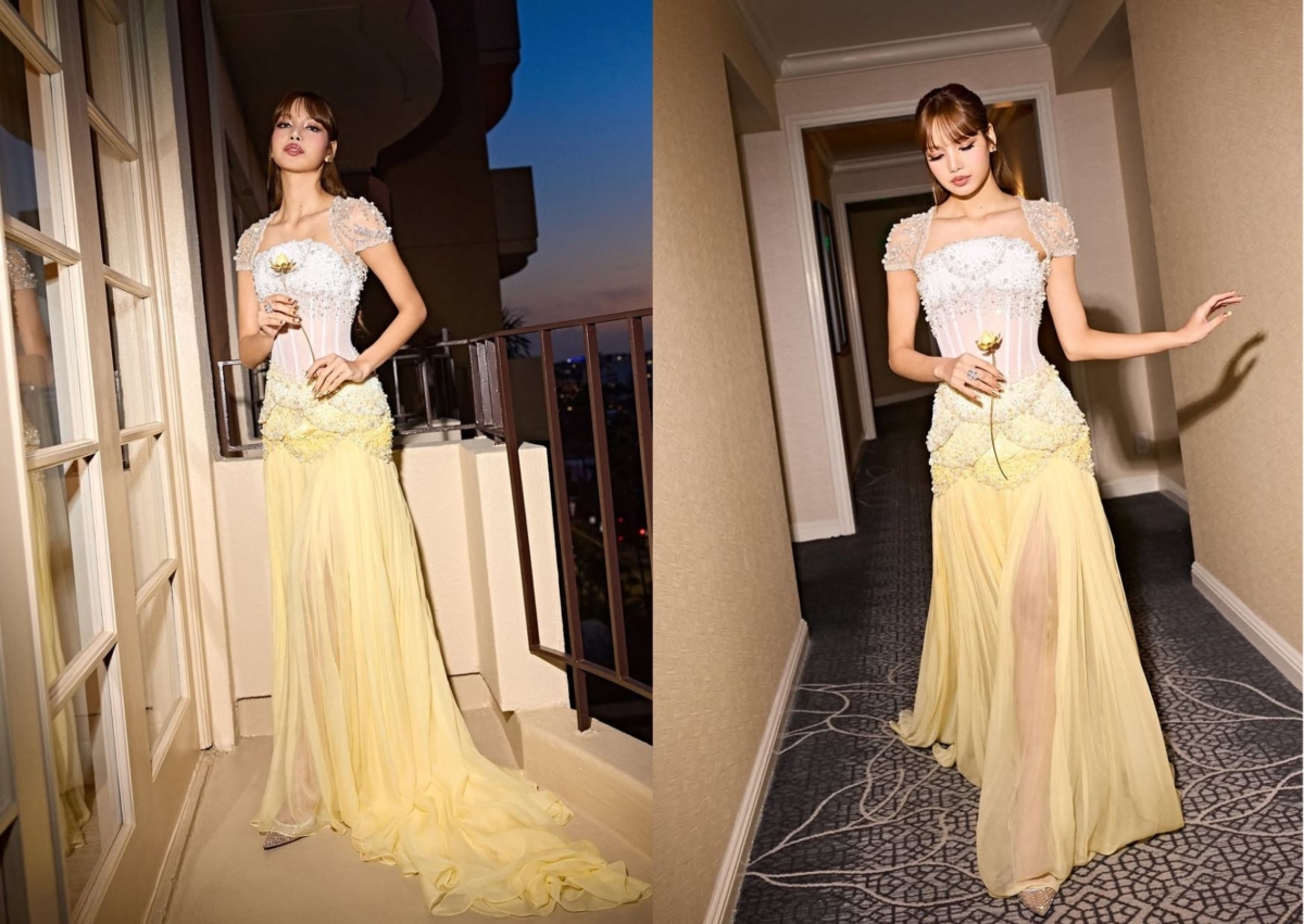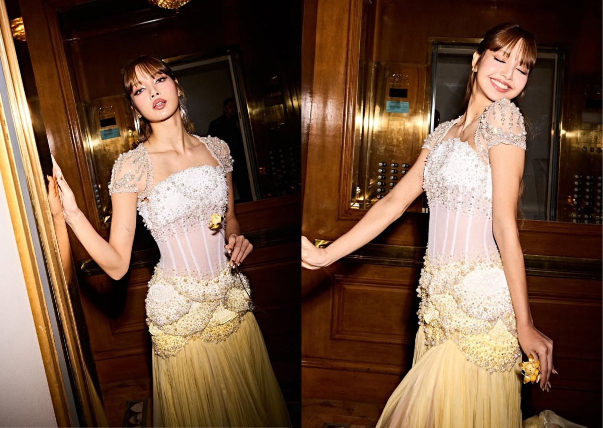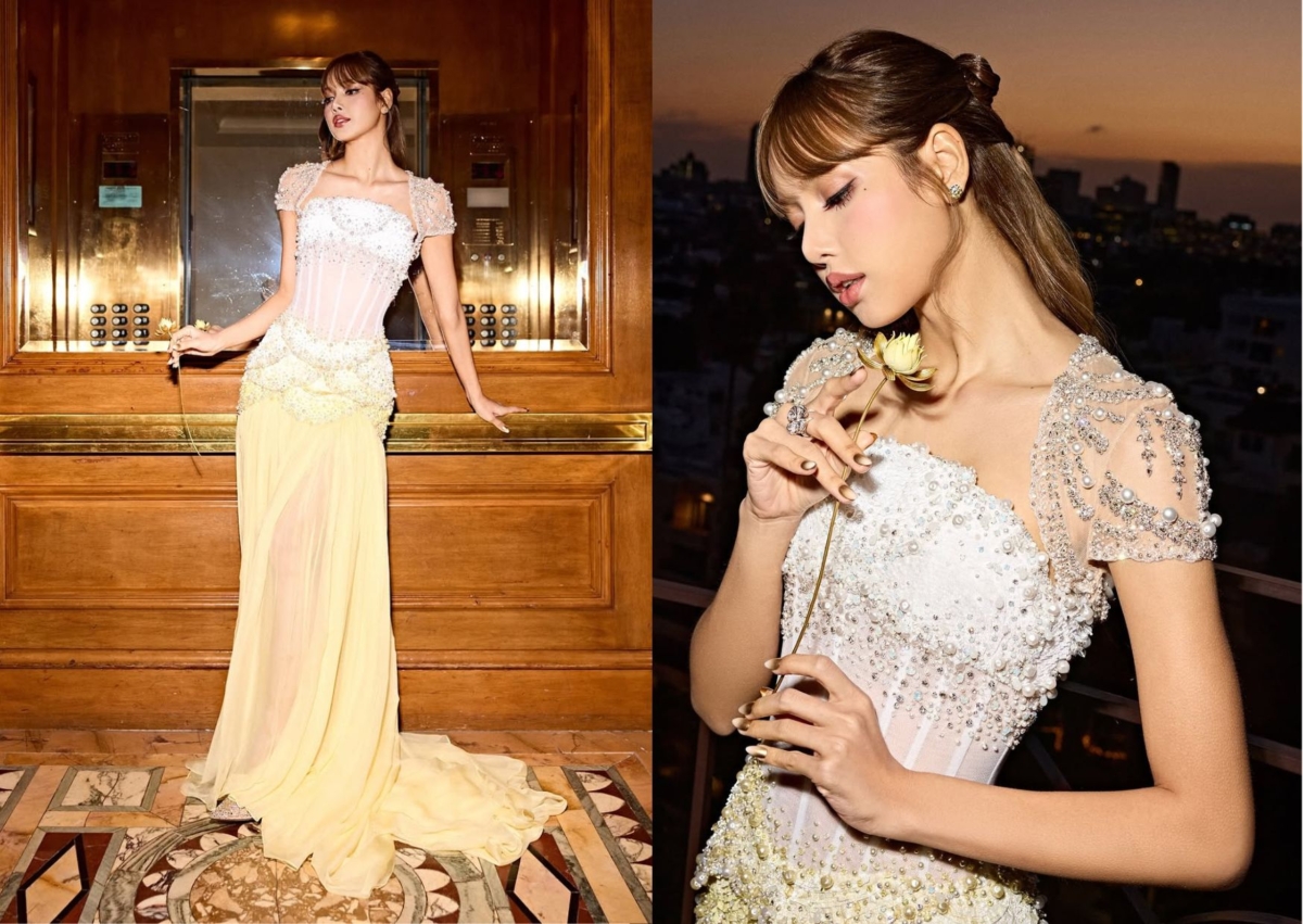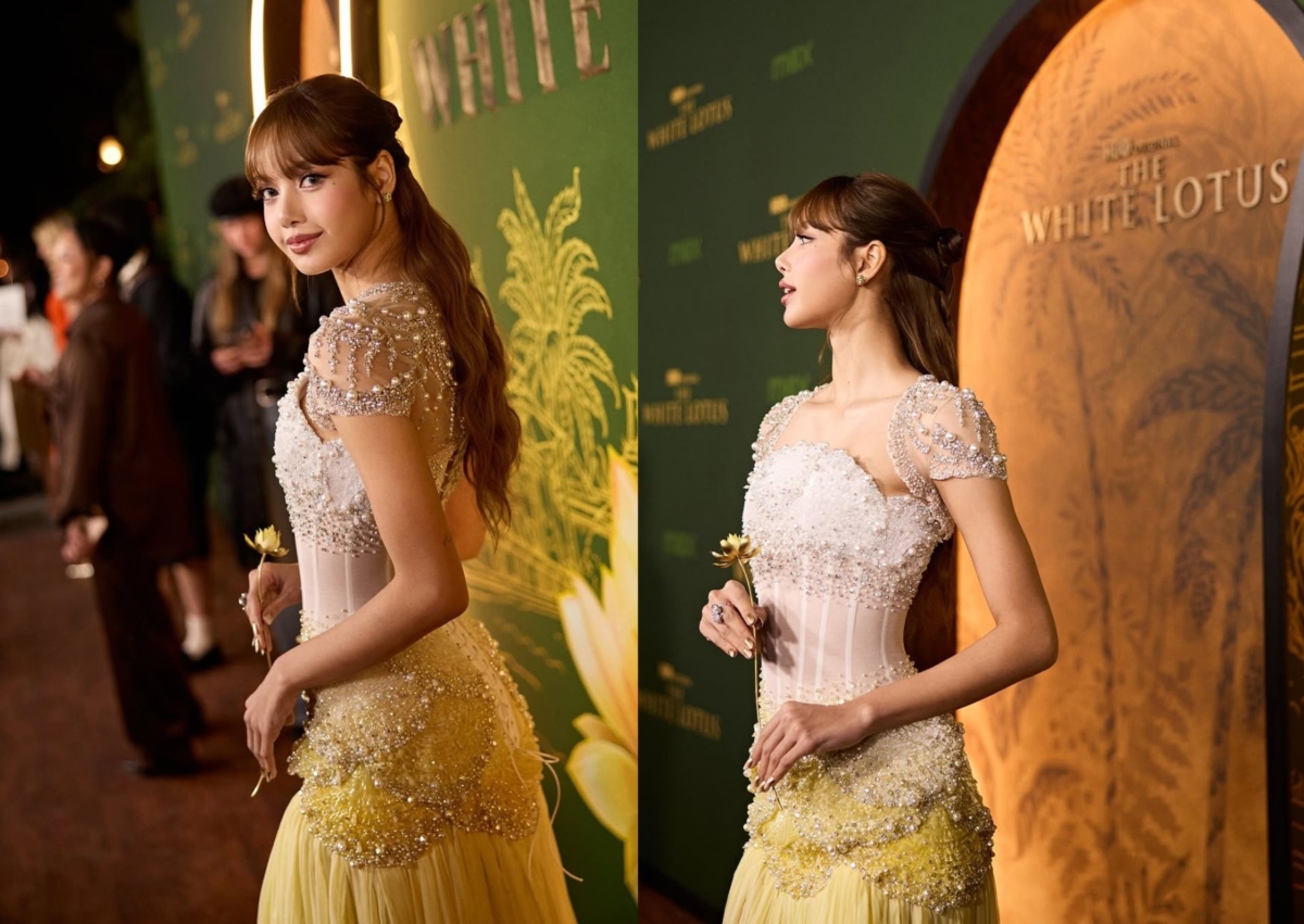 Lisa 首次以演員身分出席《白蓮花大飯店》第三季首映會,捨棄了一線精品,反而選擇韓國新銳設計師 Miss Sohee 的高級訂製服,這件禮服採用細膩的珠飾與薄紗元素縫製成,打造像是花瓣盛開的樣貌,腰間以馬甲造型為主,從白色到裙擺的黃色漸層色調很是唯美,戴著 BVLGARI 花卉戒指與耳環,手中拿著一朵白蓮花,整體搭配巧妙呼應電影。