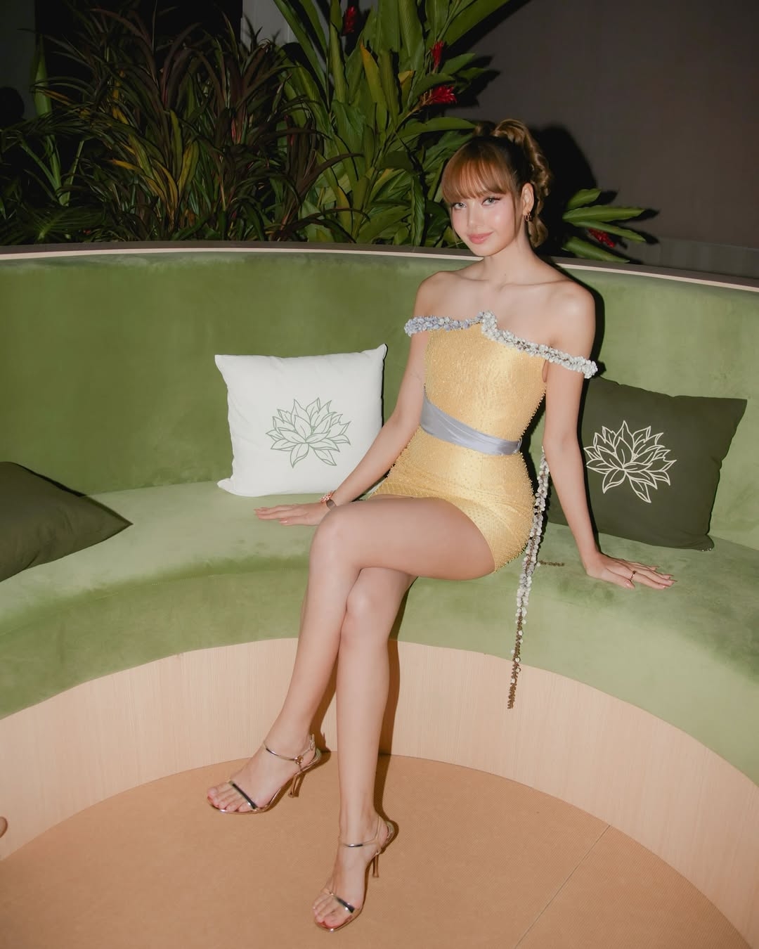 在同場曼谷的首映晚會上,Lisa 換上另一套黃色短洋裝,完美呼應《白蓮花大飯店3》的標誌黃蓮花,這套小禮服來自泰國本土品牌Meshmuseum,黃色光澤面料上繡滿細緻水鑽,由超過 2000 個花瓣排列而成的衣領,垂墜下更顯貴氣感,搭配金色細跟高跟鞋,與紅毯的粉色禮服不同感覺。