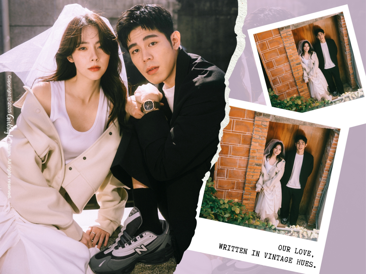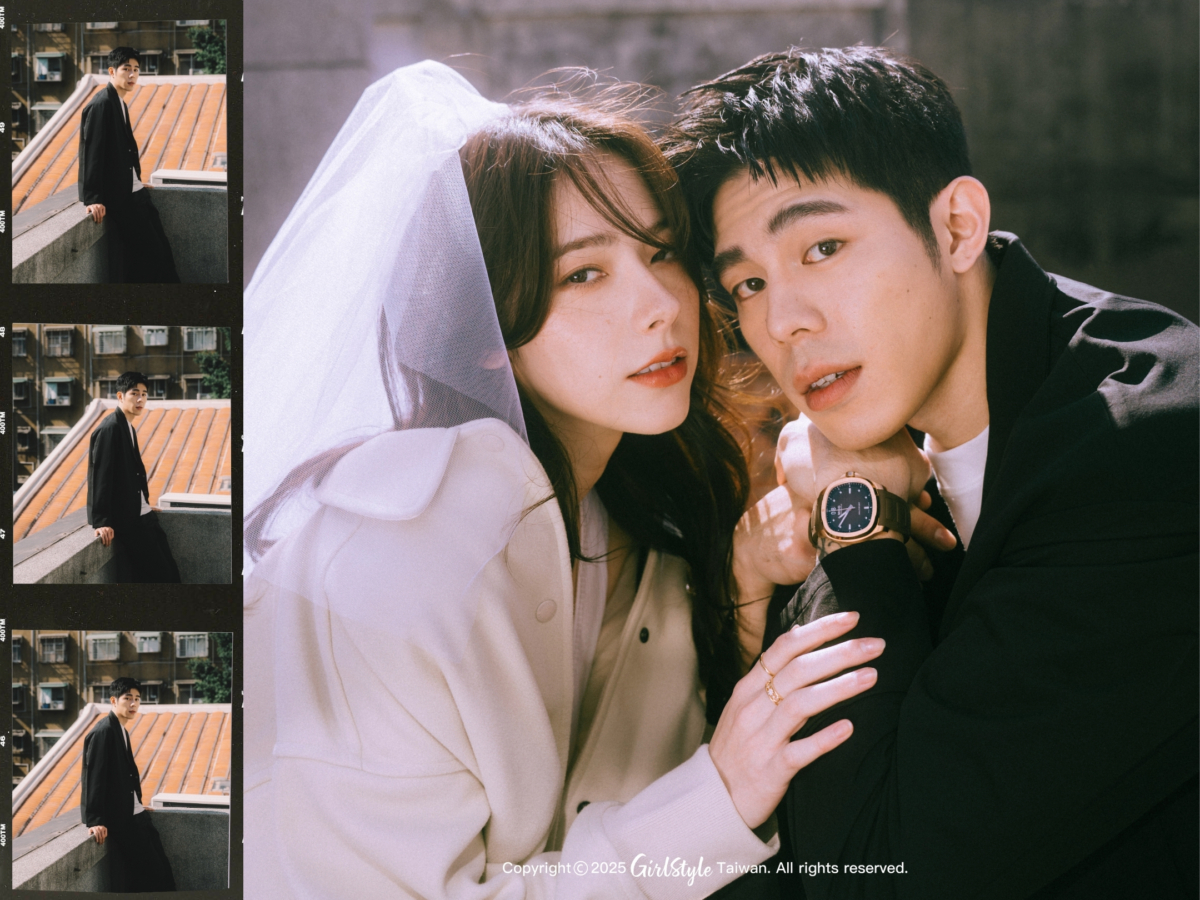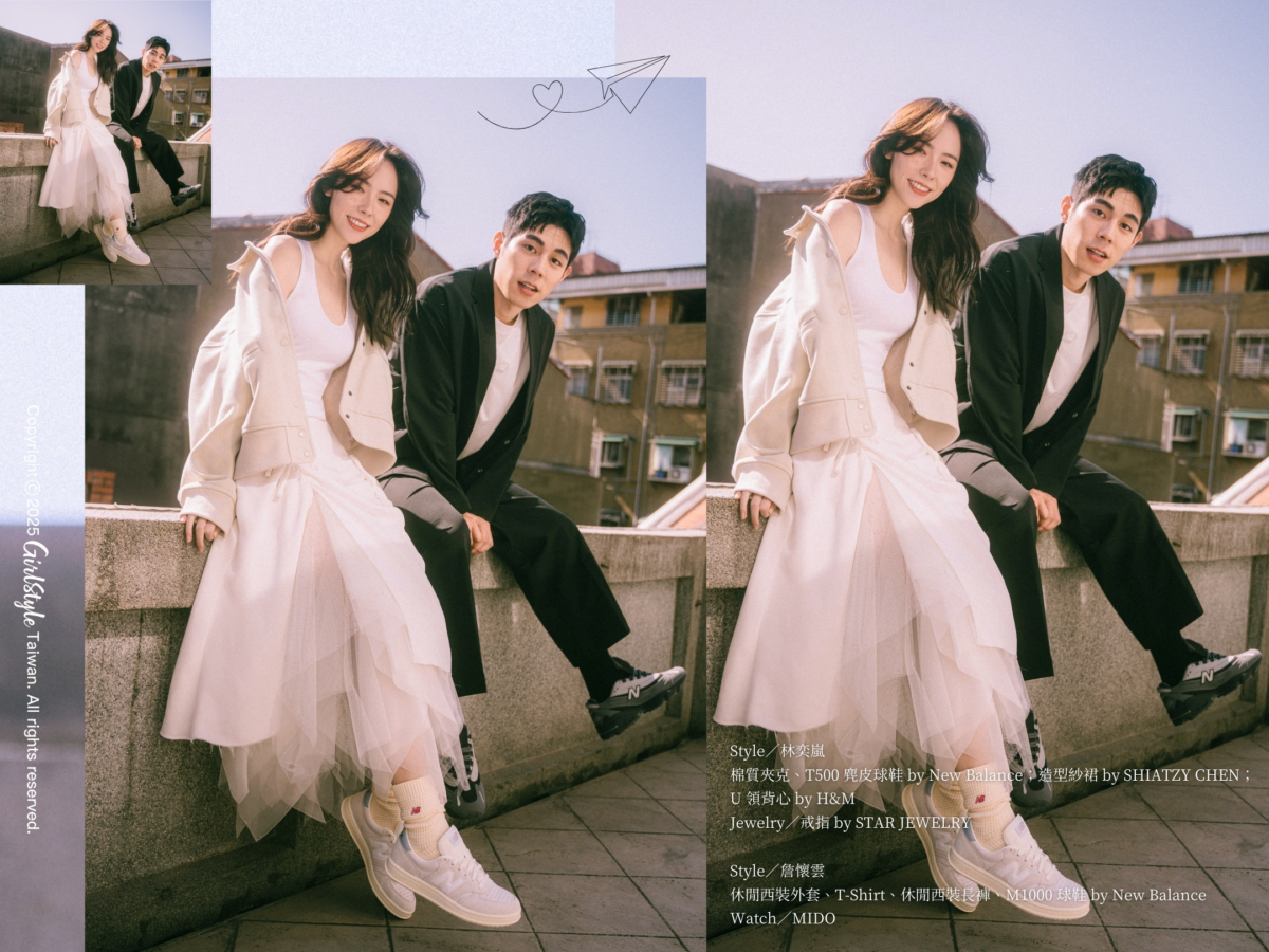詹懷雲身穿 New Balance 黑色休閒西裝外套、白色 T-Shirt 和休閒西裝褲,腳上選擇 New Balance M1000 黑色球鞋,完美詮釋千禧年代大膽復古的設計,配戴 MIDO 美度表先鋒系列 TV 腕錶,整體穿搭在正式中注入輕鬆氛圍;林奕嵐則身穿 New Balance 卡其色棉質夾克、內搭 H&M 背心和 SHIATZY CHEN 不規則白色紗裙,腳踩 New Balance T500 白色麂皮球鞋,簡約得很時髦,時而披上頭紗,流露一股復古優美的姿態。