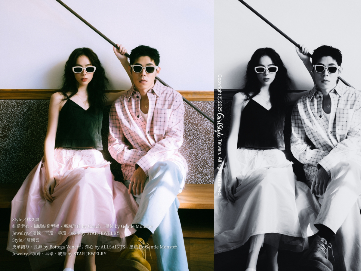 「私服喜歡穿寬鬆簡約的風格,像是白色上衣配牛仔褲、舒服的西裝褲之類的,衣服都是黑白色,覺得自己應該要開始嘗試鮮豔的衣服,和另一半約會時,也會想要追求一些儀式感。」林奕嵐對於私服的選擇也經常以簡約低調為主,這次穿上 Coach 黑色細肩背心,飾有巨大蝴蝶結的造型裙及瑪莉珍鞋,兩人不約而同選擇 STAR JEWELRY 珠寶飾品,呈現浪漫氛圍,加上 Gentle Monster 墨鏡注入帥氣感。