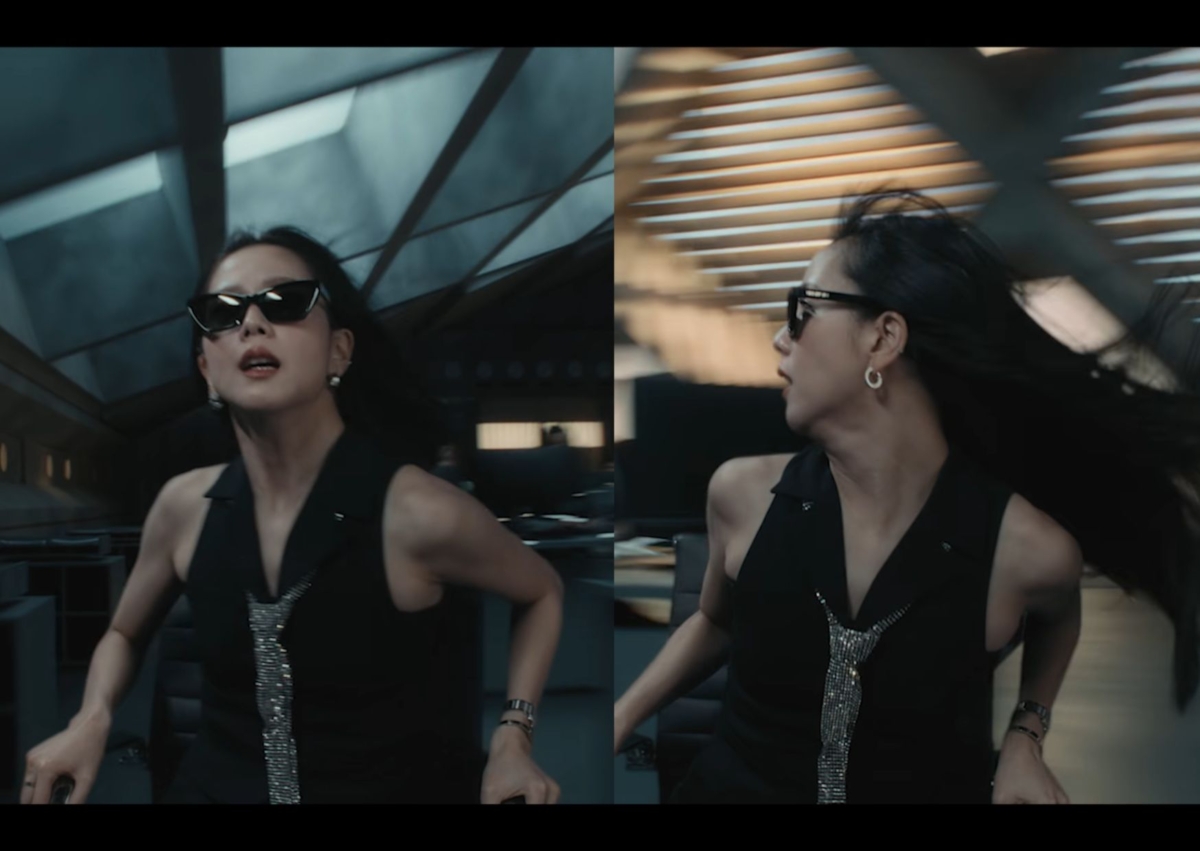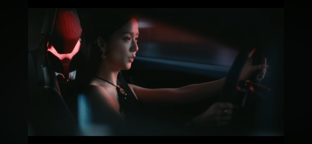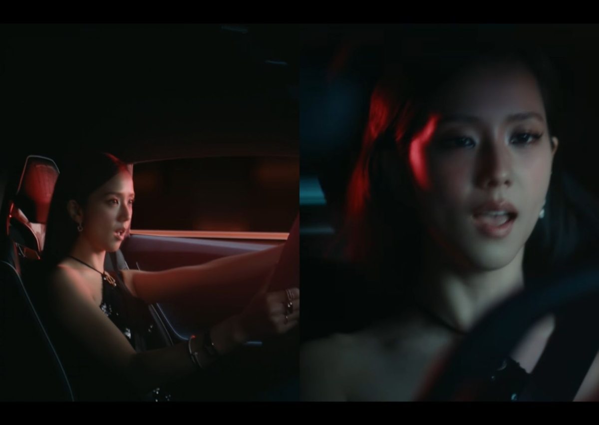 場景轉換到開著極速跑車的畫面,Jisoo 選擇身穿 Dior 亮片抹胸背心,手握方向盤的特寫可以見到她戴著多款 Cartier 戒指,果然是最稱職代言人,一舉把兩個代言品牌都帶上畫面,Jisoo 這套以黑長直髮亮相,妝容則呼應服裝呈現未來光澤感,一路狂飆、氣場太強大。