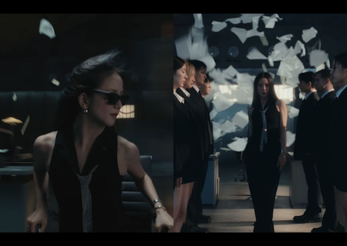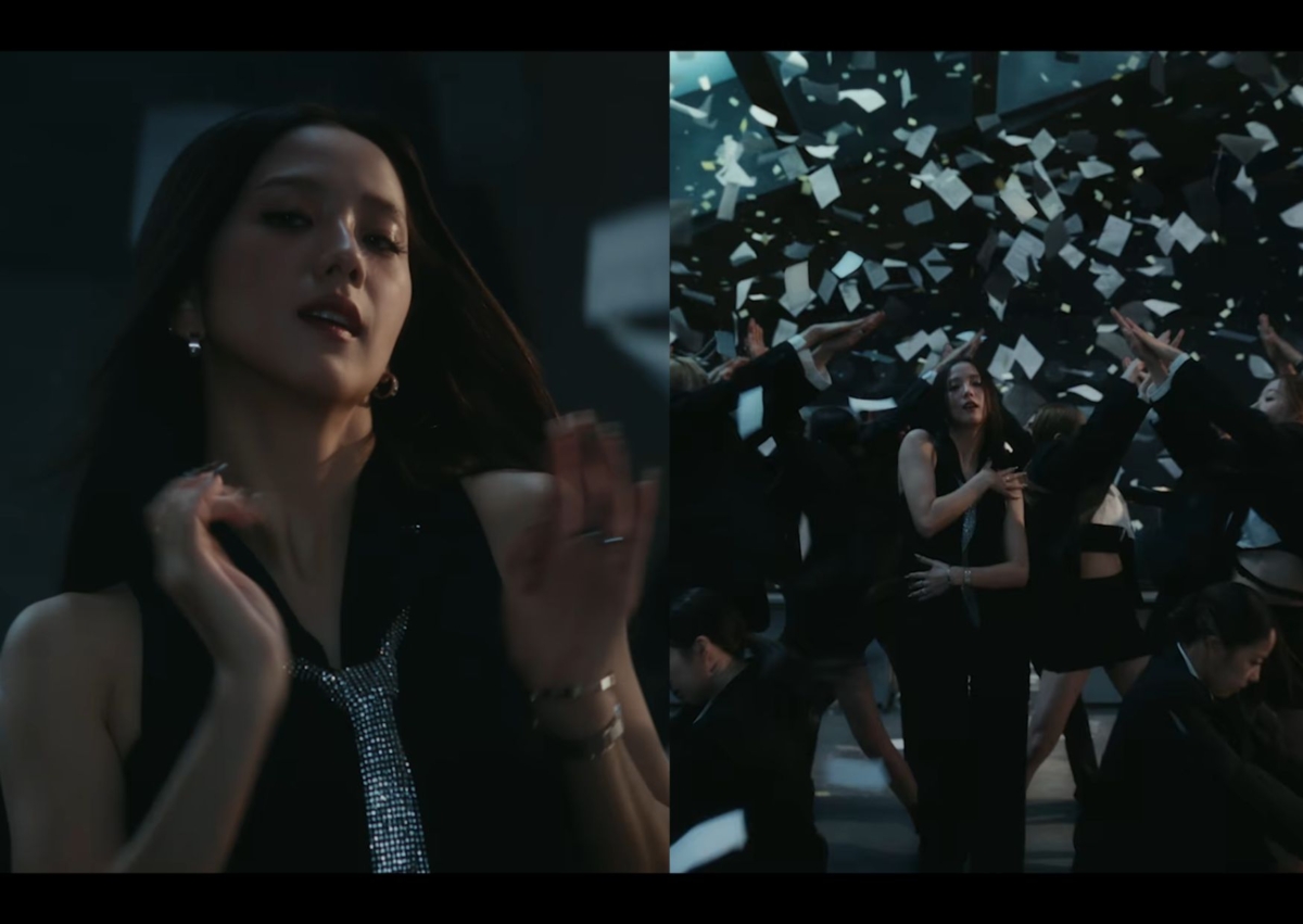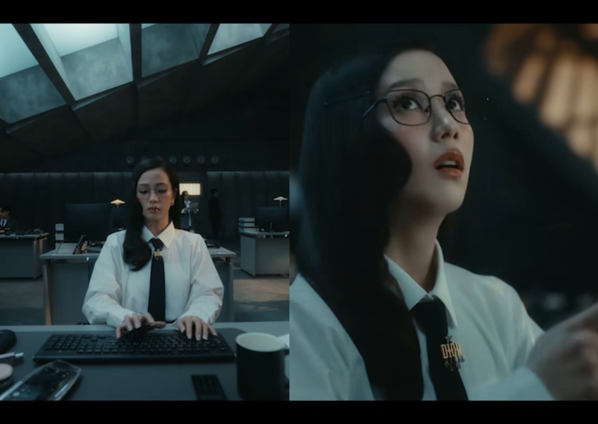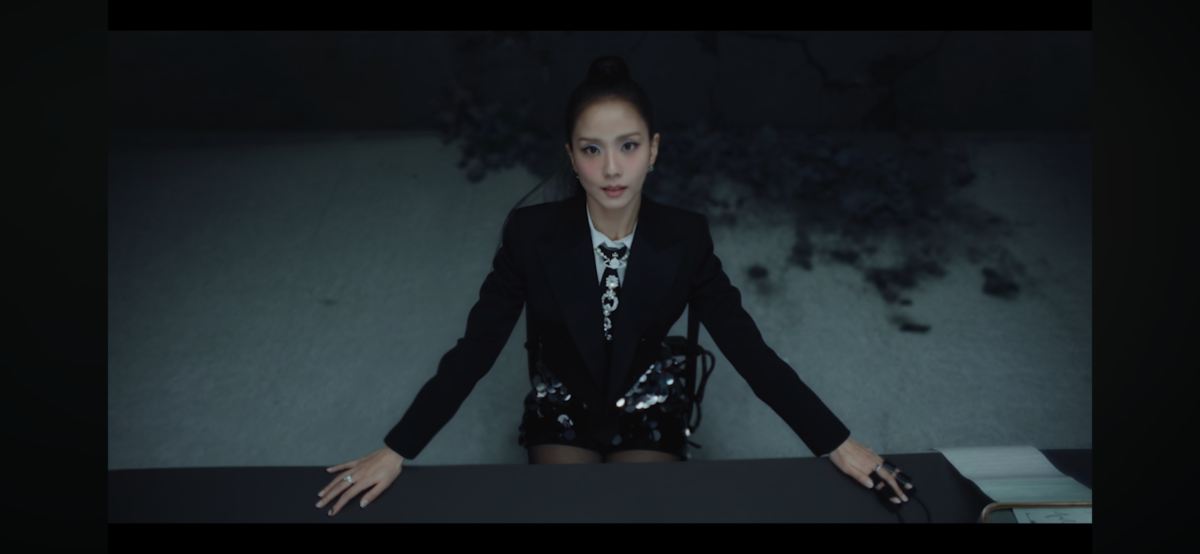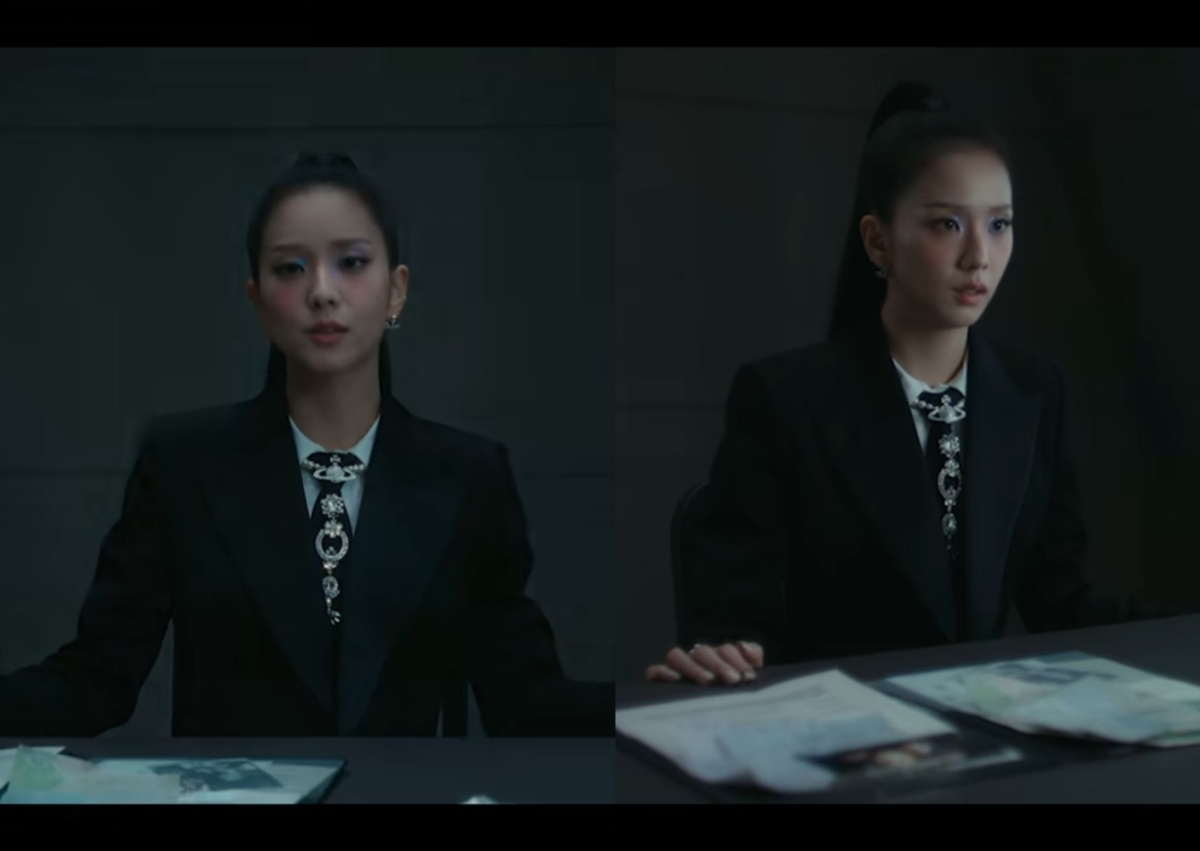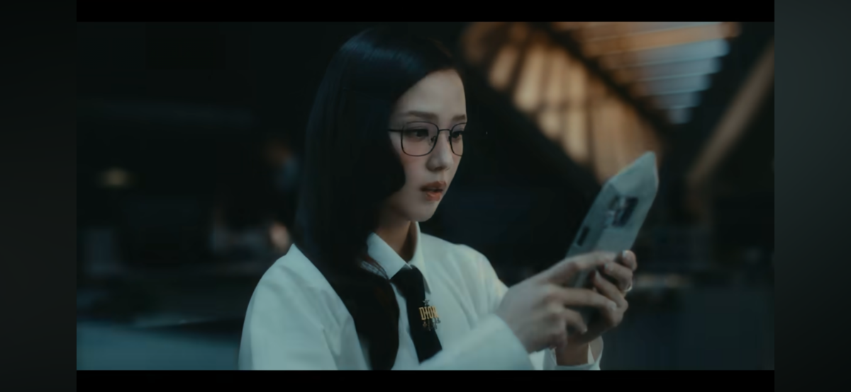 MV 開場聚焦於辦公室座位上, Jisoo穿著 Dior 白襯衫和黑色領帶,同時特別在領帶別上了帶有品牌標誌性元素的星星、蝴蝶結和蜜蜂胸針,一頭復古波浪捲髮加上黑框眼鏡,完美詮釋時尚書呆子風,妝容上也以大地色系呈現,著重在眼妝上,帶有一抹復古氣息。