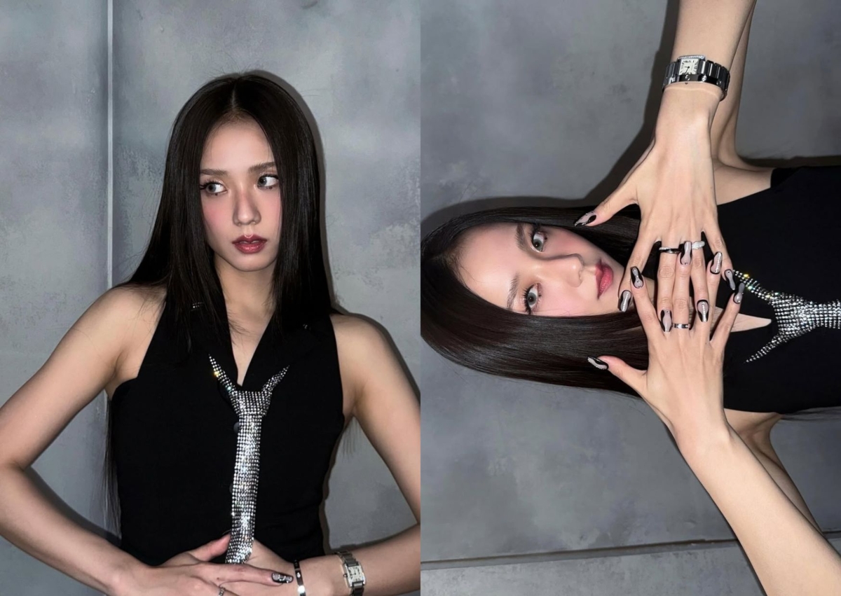Jisoo 這幕以極具新鮮感的齊瀏海、黑長髮造型登場,抹上強烈視覺的深色唇膏,打造暗黑又神秘的人設,身穿格魯吉亞小眾時尚品牌 Lado Bokuchava 2024 Resort 度假系列的穿孔西裝套裝,搭配同品牌長靴,不經意露出性感小蠻腰性感和腹肌,整體風格既有女人味又冷酷豔麗。