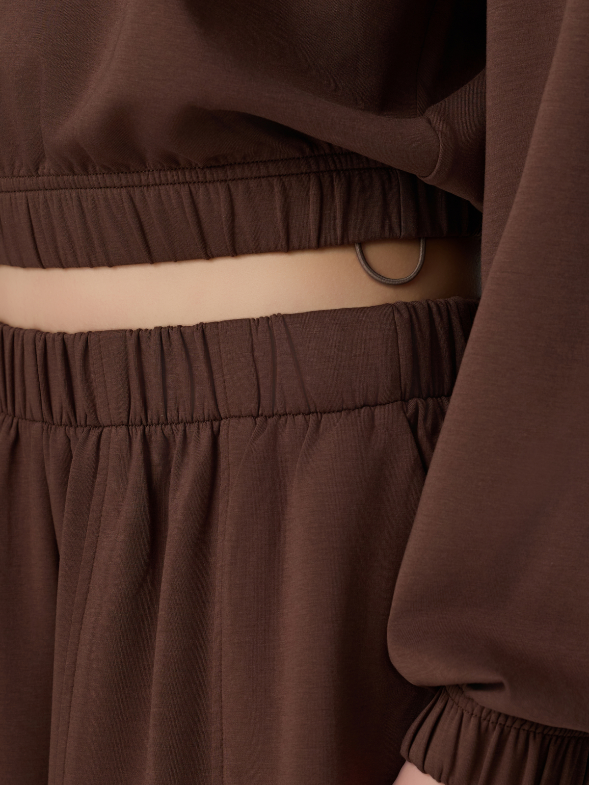 另一重點單品則是全新設計的連帽套裝,其中純色系透過簡約俐落的剪裁與高品質材質詮釋出純粹與力量,不只是日常穿搭,更是一種態度的展現,選用舒適親膚的輕雲朵棉感面料,大 V 領結合大連帽造型,露出頸部肌膚拉長線條,下襬內側鬆緊抽繩細節,可依需求向上反摺收緊穿著,共推出三色黑色、白色與榛果棕。