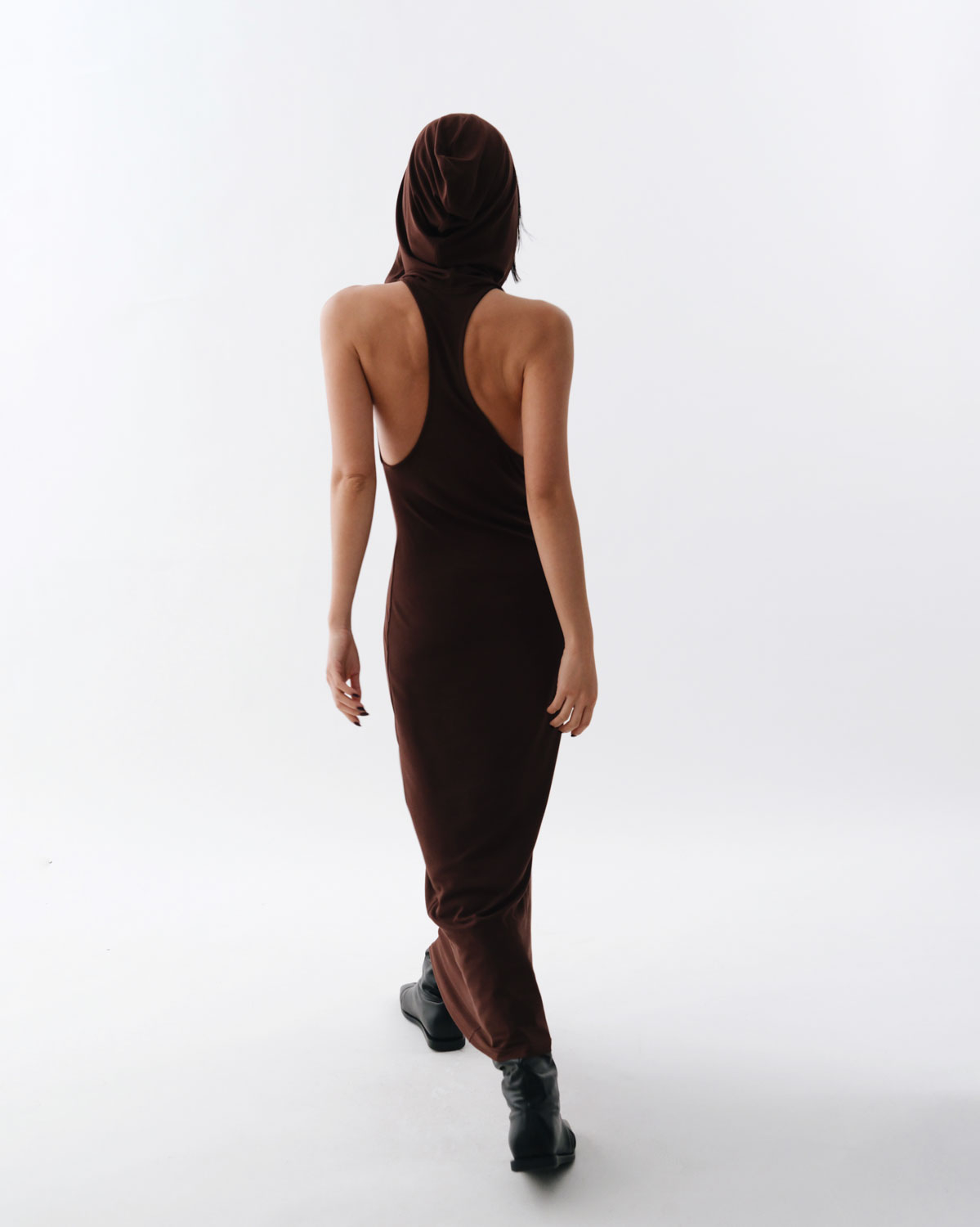 系列重點之一的挖背連帽洋裝,採用大挖背剪裁結合正面削肩線條,側面剪接間點下移,大連帽造型,前領口堆疊造型增加隨性感,裙身下襬微傘狀營造柔軟裙襬,共推出兩色榛果棕與黑色。