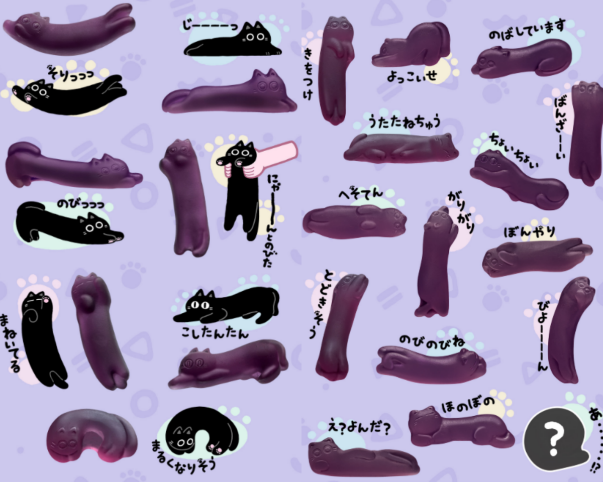 貓咪拉長軟糖總共推出21款+1款隱藏版,每包有13個款式,每一顆紫色葡萄口味的貓貓軟糖呈現出各種慵懶姿勢超療癒,找找看有沒有同款你家貓貓XD 大家還可以挑戰能不能把軟糖貓貓拉得更長~愛貓人士一定要買全蒐集♡