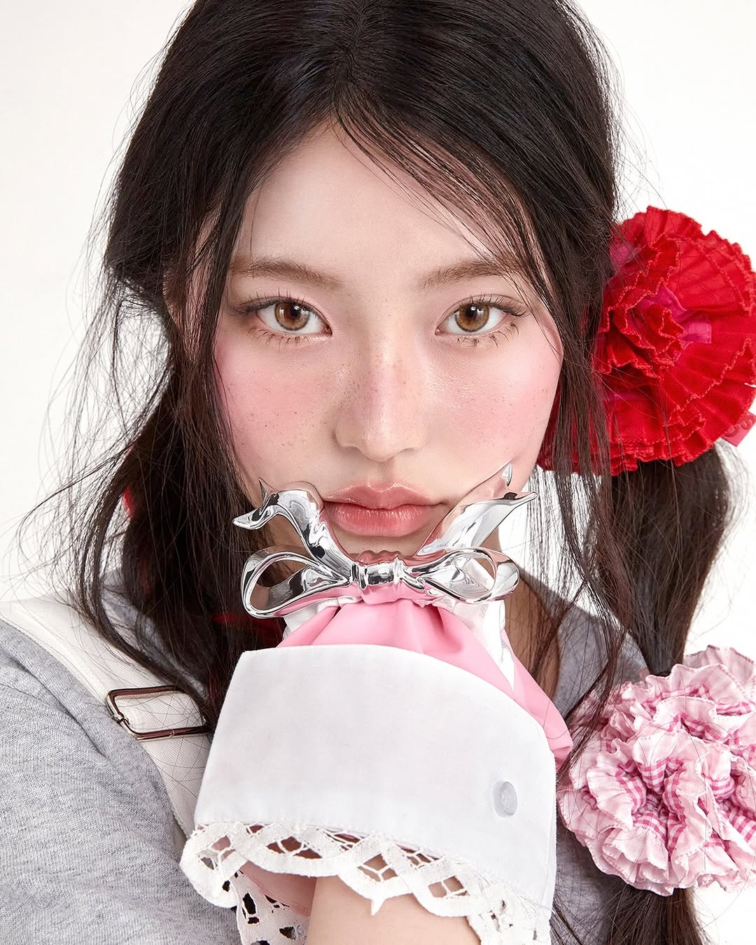 KiiiKiii團員們的底妝沒有傳統K-pop女團那種極致霧面或玻璃感,而是走 「自然光澤肌」 的路線,強調肌膚的自然光澤,避免厚重感,可以使用輕薄的粉底液或氣墊,局部遮瑕,保留肌膚的天然質感。妝感輕盈像是剛剛睡醒的森林精靈,帶著一點「天生好膚質」的錯覺。