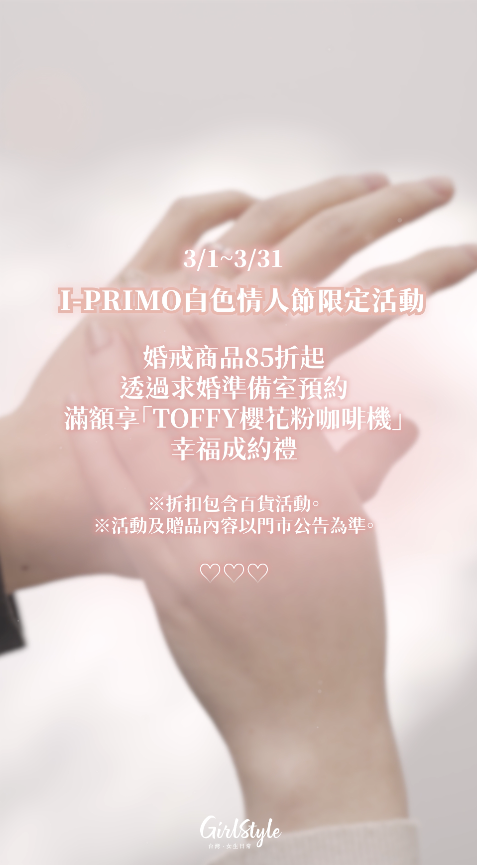 此外,I-PRIMO於白色情人節也祭出特別優惠,於3/1-3/31購買婚戒商品85折起,購買套戒還可多享5%折扣,2/1-3/31透過「求婚準備室」網站預約購買鑽戒或對戒,立約滿額享「TOFFY櫻花粉咖啡機」幸福成約禮,更多優惠就等你到I-PRIMO門市解鎖囉~