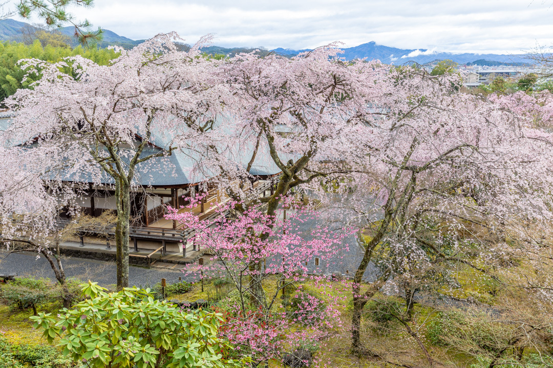 天龍寺位在竹林小徑中間的岔路,1339年建造現已被註冊為世界遺產。日本傳統庭園設計就像是大花園,園區內有許多不同寺廟神社,種植大約200棵櫻花樹,包含染井吉野櫻花、枝垂櫻與山櫻花,沿路充滿白粉色相間的櫻花如天空瀑布般襯托在天龍寺與池塘旁,莊嚴又優雅的氛圍相當壯觀。