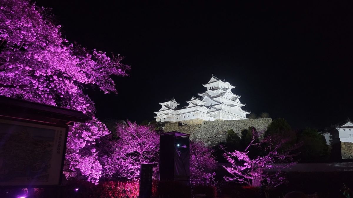每到姬路城夜櫻活動期間,這座被譽為「白鷺城」的世界遺產,便會在夜晚展現出與白天截然不同的夢幻之美,透過燈光的巧妙映照,原本純白的城牆彷彿披上一層柔和光暈,與周圍粉嫩的夜櫻交織在一起,呈現出一幅如詩如畫的絕美景致,相較於白天的喧囂,夜晚的姬路城多了一份靜謐與浪漫~
