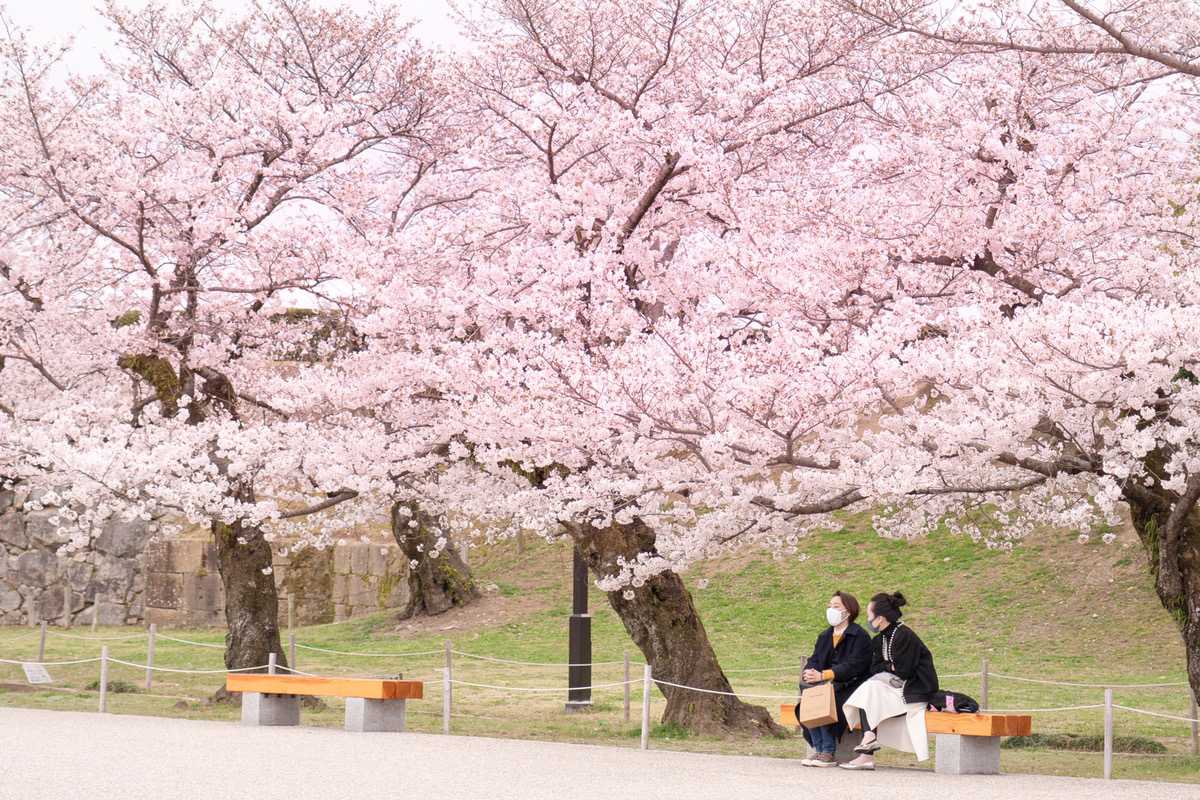 作為姬路城主要入口區域的「三之丸廣場」,周邊種植了染井吉野櫻、八重櫻、枝垂櫻等多種櫻花,每當櫻花盛開時,整個廣場便會被這些不同品種的粉色櫻花所環繞,形成一片繽紛浪漫的花海,無論是在廣場內悠閒散步、拍照打卡,還是與親友一同野餐都非常合適!
