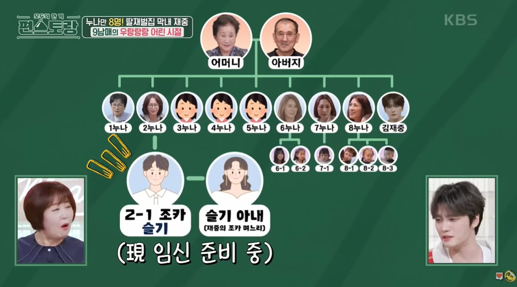 不過金在中即將迎接的這位外甥孫有可能並不是大姊兒子的小孩,應該是二姊兒子的!因為今年1月家人們與他出演《新品上市便利餐廳》節目時,大姊就預告過他要當爺爺了,原因是二姊的兒子已經結婚,所以按照這樣看,比較有可能是二姊兒子的小孩~