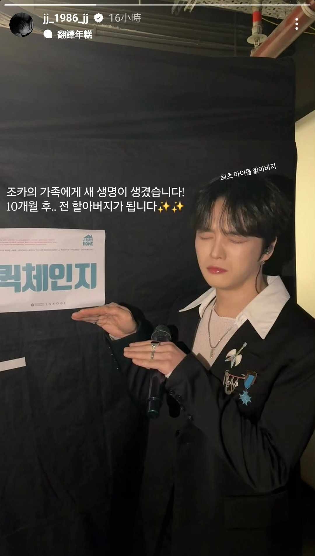 結果就在24日,金在中突然在IG限時動態與大家分享了驚喜,年僅39歲的他真的要當阿公了!照片裡金在中用哭哭的表情,寫下「姪子的家庭迎來了新生命!10個月後...我就要當爺爺了(同舅公意思,韓語無分別)✨✨」雖然一時之間難適應,但他還是很高興的加上兩個閃亮亮的表情符號,甚至還稱自己是「最初的偶像爺爺」,只能說真的是史無前例XD