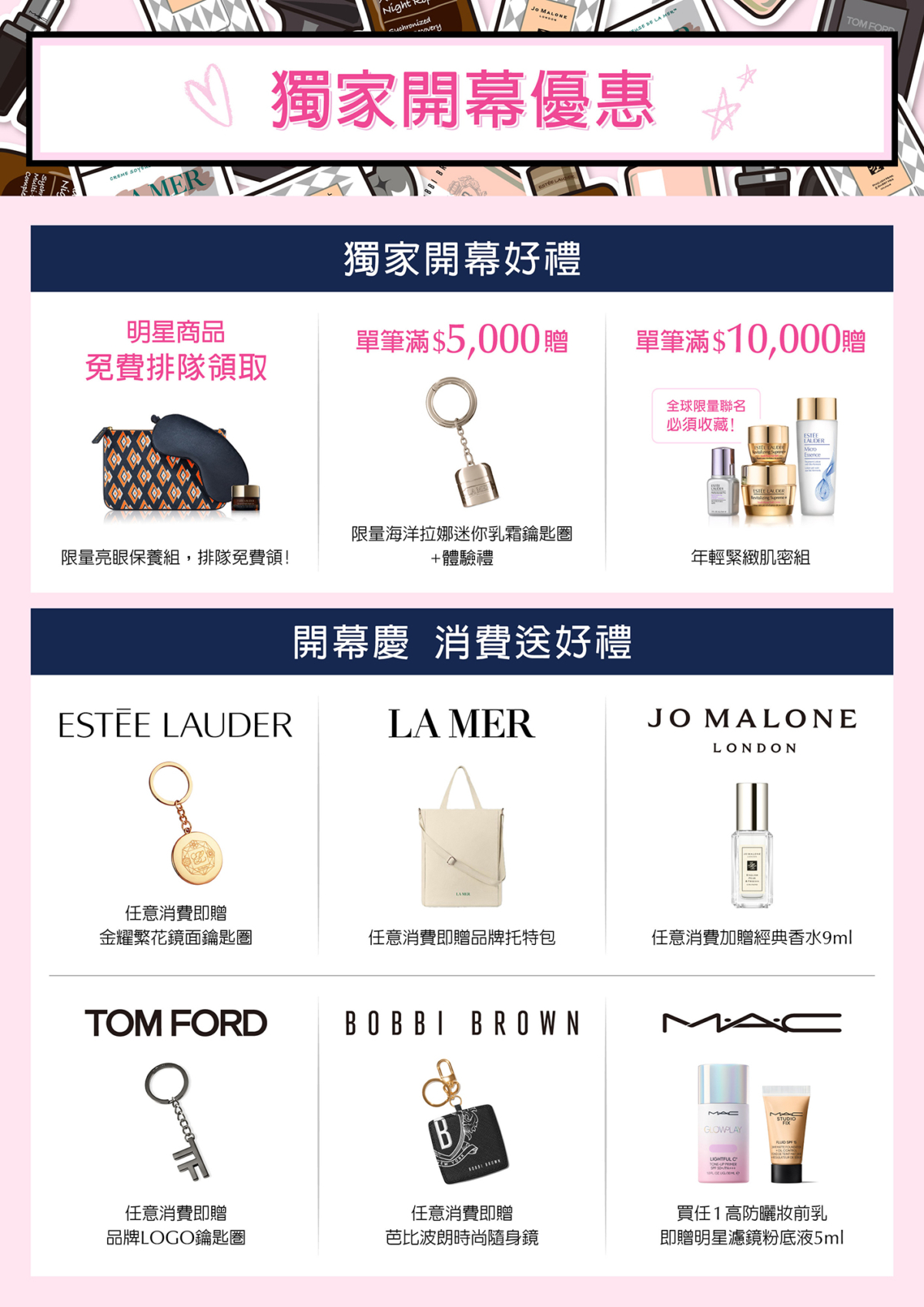 3/20(四)-4/30(三)凡於雅詩蘭黛集團旗下品牌消費,除各品牌專屬禮遇外,全店贈品跨品牌禮物包: