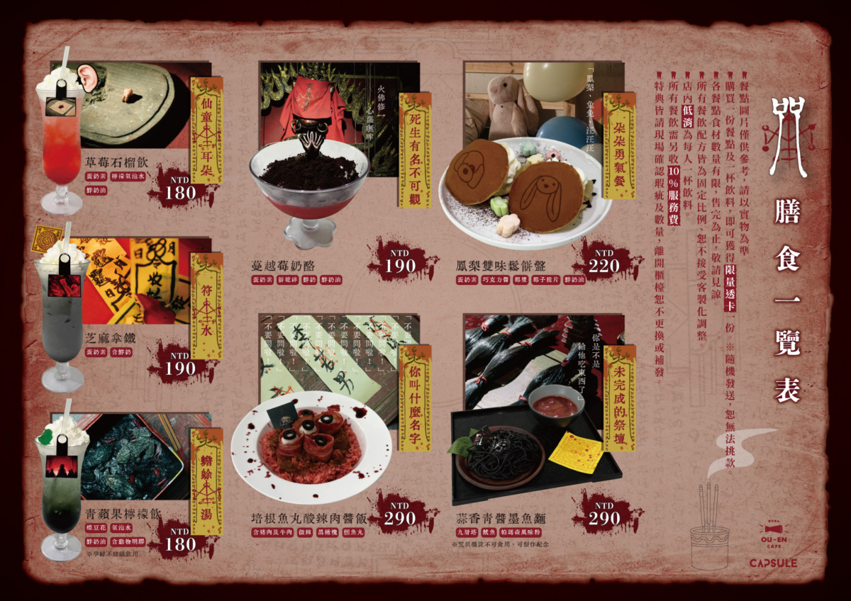 誠心奉上「陳家獻祭宴」來到這裡的人就必須吃下!一共推出4款主食餐點「朵朵的勇氣-鳳梨雙味鬆餅盤」、「未完成的祭壇-蒜香青醬墨魚麵」、「死生有名不可觀-蔓越莓奶酪」、「你叫什麼名字-培根魚丸酸辣肉醬飯」及3款飲料「仙童耳朵-草莓石榴飲」、「符水-芝麻拿鐵」與「蟾蜍湯-青蘋果檸檬飲」。購買一份餐點+飲料即可獲得隨機透卡一張。