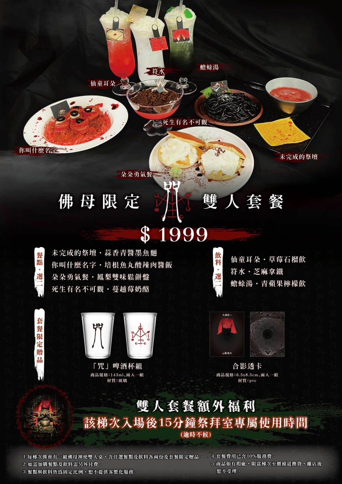 想要在佛母庇佑之下享用神聖的餐點,雙人套餐就是你在找的慰藉...。雙人福利不但包含所有餐點飲料,可以坐在「佛母神使雙人桌」專屬位之外,還會有15分鐘祭拜室專屬使用時間~結束時更有套餐限定商品「『咒』啤酒杯組」、「合影透卡」可以帶回家。