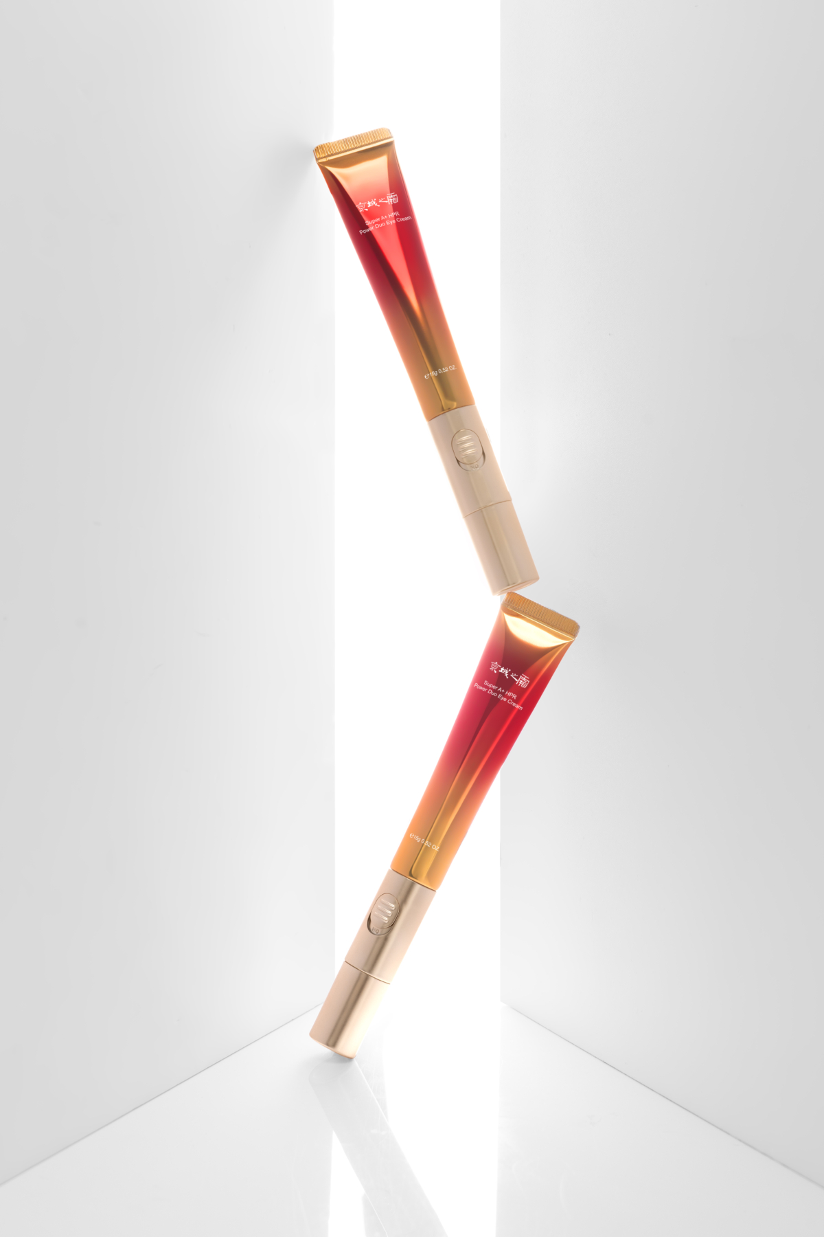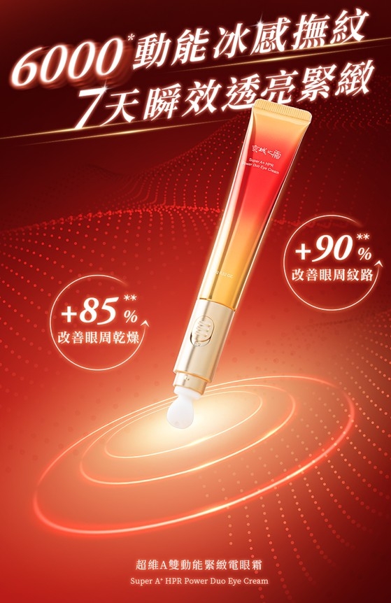 「超維A雙動能緊緻電眼霜」,使用最新科技的冰瓷微導動能器,主打使用陶瓷材質的眼霜頭,材質安全不致敏,且陶瓷本身導熱性低,具物理快速降溫特性,使用中透以微涼感,可以幫助舒緩浮腫,並且在台灣比較潮濕的環境中也不易氧化。另外45゚角度符合人體工學設計,能完美貼合眼周,無死角,精準激活眼部穴位。