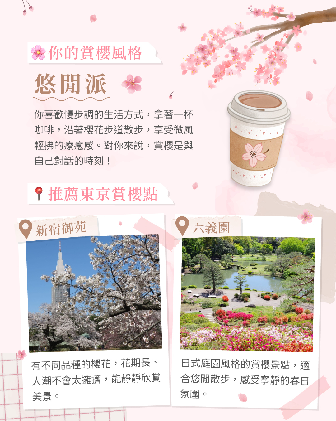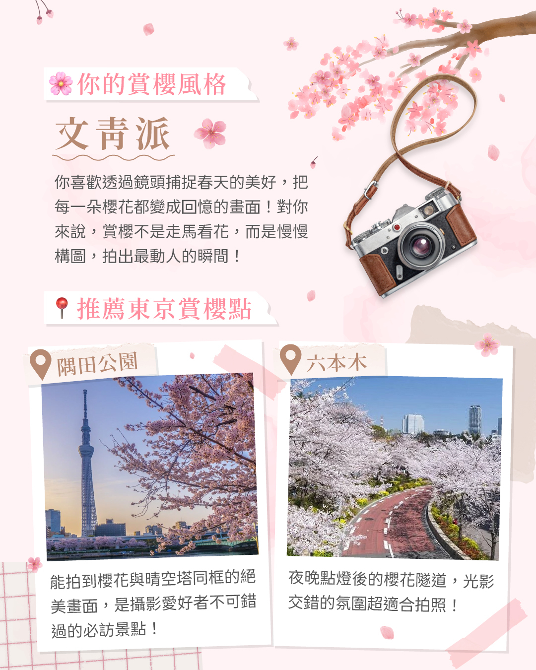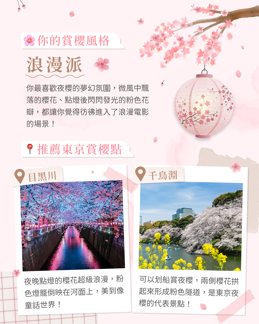 想知道哪個東京賞櫻地最對你的味?🌸 選一個最吸引你的答案,心理測驗立刻揭曉!浪漫夜櫻、熱鬧祭典、文青美拍...找到你的命定賞櫻風格,一起暢遊東京沉浸於粉色浪漫!