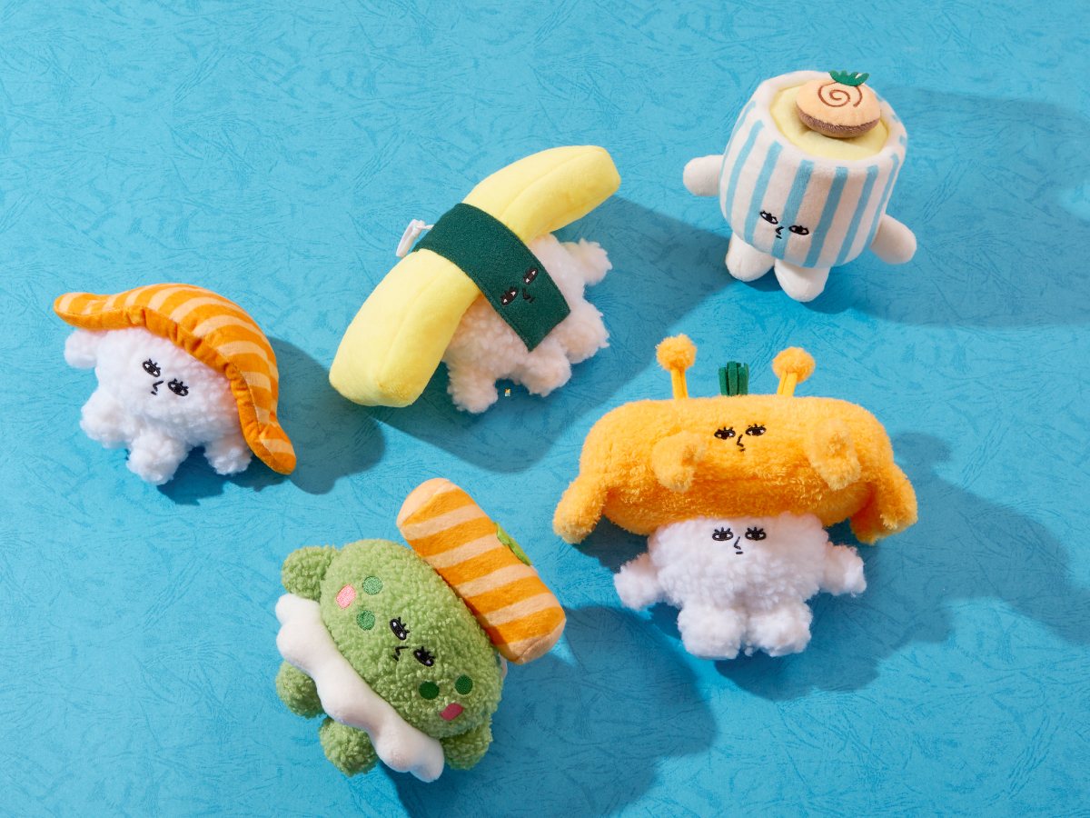 除此之外,還將餐點搖身一變成為玩偶,推出新菜單上的「鮭魚塔酪梨」、「蒜蓉鮑魚茶碗蒸」還有經典品項「軟殼蟹天婦羅壽司」、「翹翹板玉子燒壽司」、「鮭魚壽司」五款可愛爆表的玩偶吊飾,壽司身體與呆萌表情每一款都超級療癒吸睛!