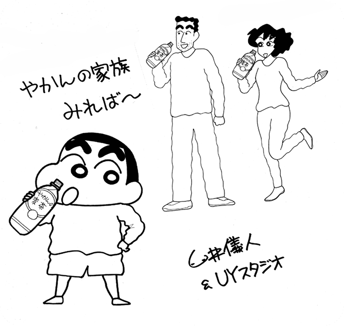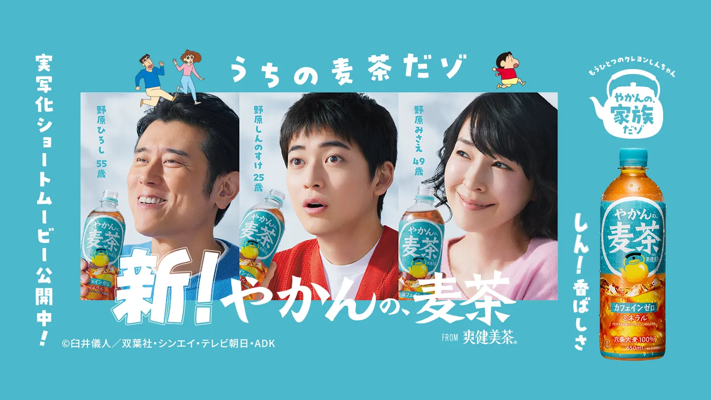 やかんの麦茶與《蠟筆小新》合作,在4月9日推出蠟筆小新真人版《原來是水壺一家啊!》的系列短片,由麻生久美子、高橋文哉、原田泰造飾演49歲的野原美冴、25歲的野原新之助與55歲的野原廣志。目前公開了3集故事短片,背景講述野原新之助(小新)從自由自在的小孩成長為25歲的成年人,長大後的他離開家鄉春日部一邊工作一邊獨自一人在市中心生活,儘管和父親和母親相離遙遠,但他們之間仍然保持著童年時的親密關係。