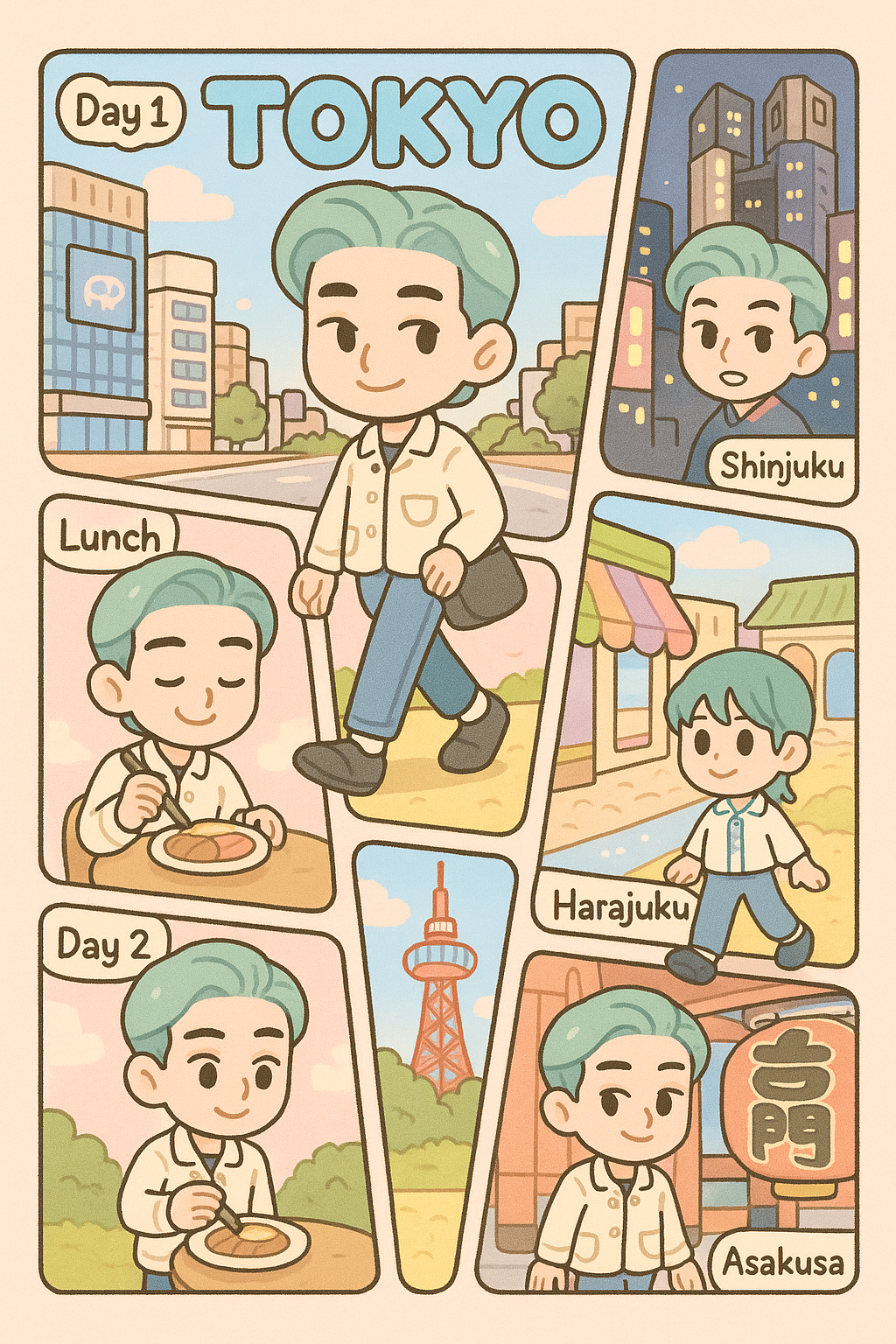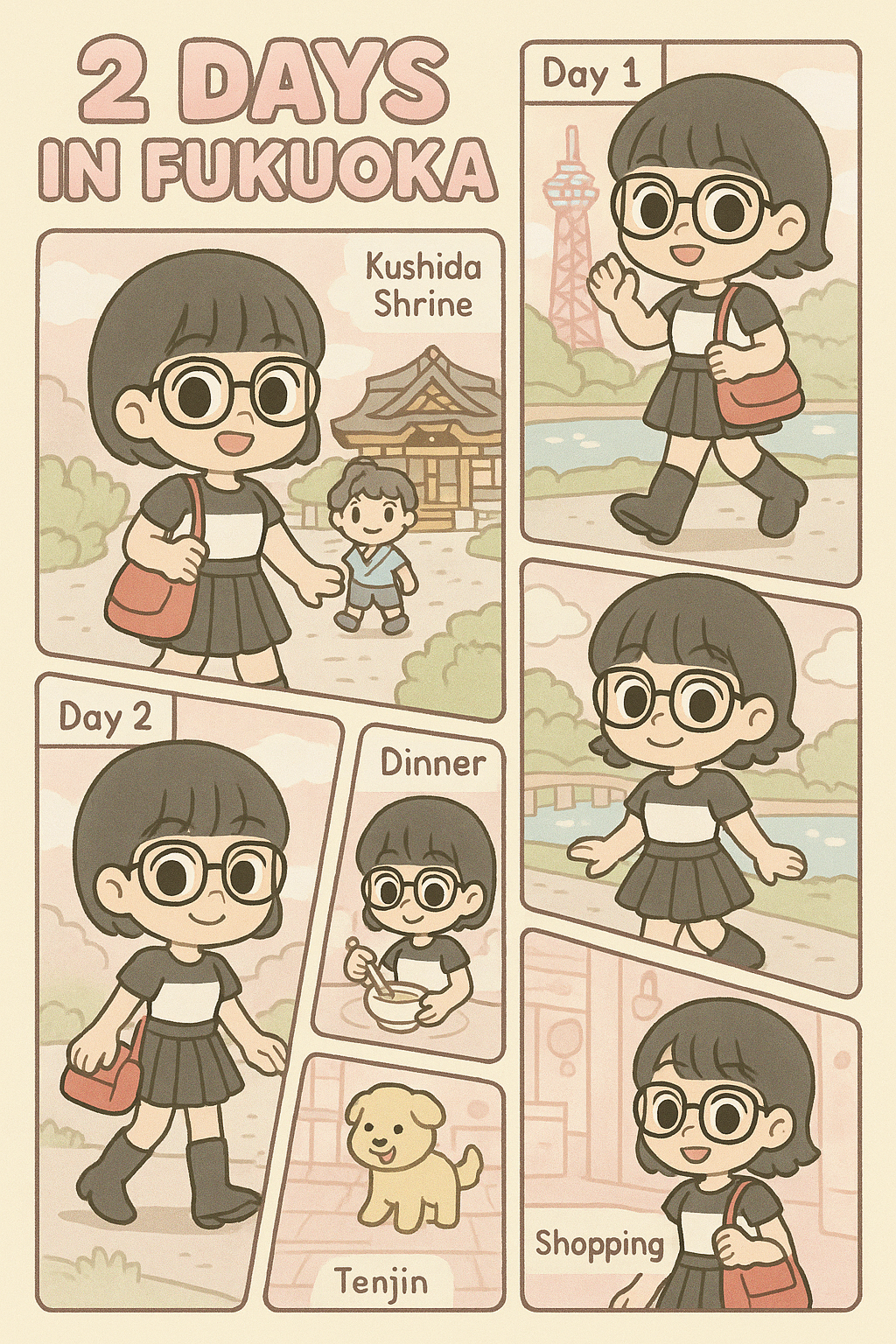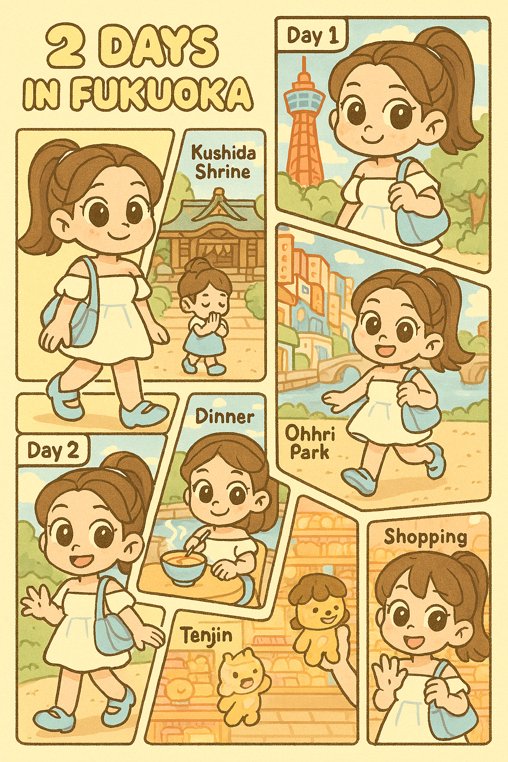 請將以上規劃的兩天行程內容生成漫畫頁,並以不規則多格分鏡方式呈現兩天行程