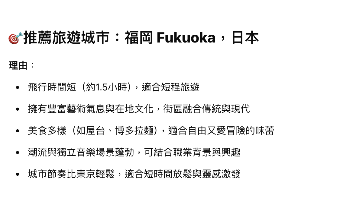 只要提供MBTI、星座和血型等基本資料,AI就能透過個性分析,幫你快速找出最適合的旅遊地點,ChatGPT分析結果也會同步說明適合原因,且還會一併推薦適合的當地行程~